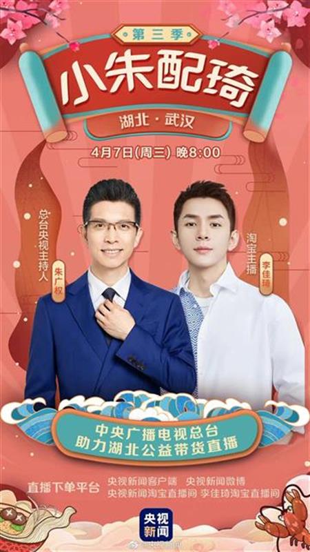 这次,“小朱配琦”又来为湖北带货了。4月3日,李佳琦官博发布消息,“4月7日晚来佳琦直播间,带你品味荆楚鲜”。