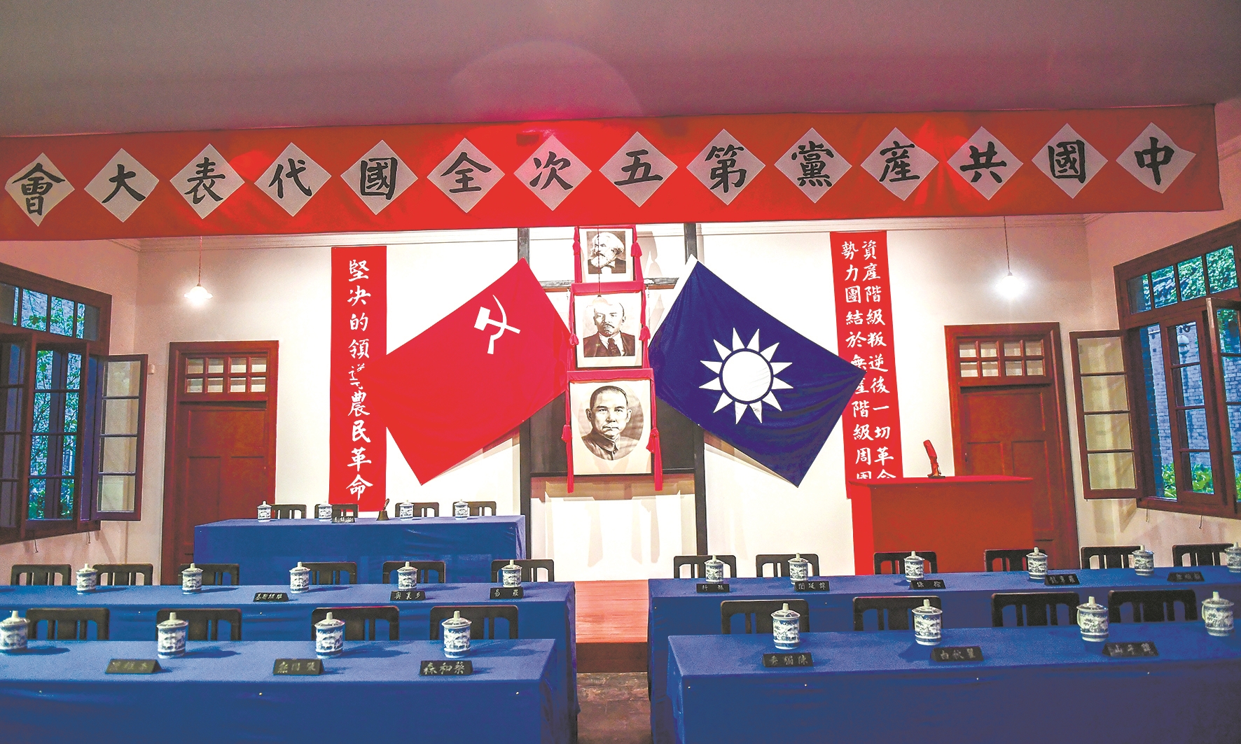 中共五大开幕式的复原陈列,再现了当年会场的布置:大会主席团座位、参会代表的座位、会场主席台上方悬挂的会标及两侧墙上的各色标语。在这里,身着长衫的陈独秀代表第四届中央执行委员会进行了长达6个小时的《政治与组织的报告》,内容涉及中国各阶级、土地、无产阶级领导权、军事、国共两党关系等问题。