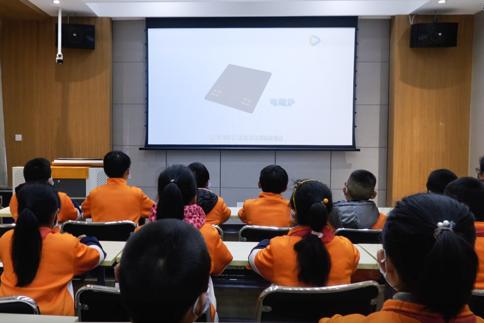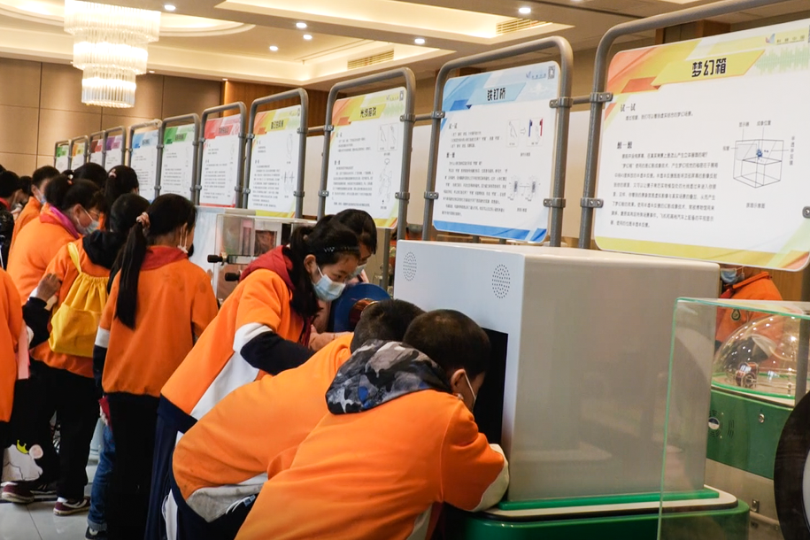 在现场,学生们被神奇的科学实验吸引着,有的在"梦幻箱"和"空中成像"前驻足,有的在探寻"旋转机械手"的奥秘,有的亲身操作着"变换的风景"、"隔空称重"、"骨穿导"等展品,还有的学生们正端身正坐地观看着科普视频。