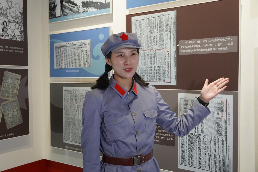 瑞金红井景区内的“中央苏区时期中国共产党纪检监察史”陈列馆里讲解员杨璐在向参观者讲解。新华社记者 姚子云 摄
