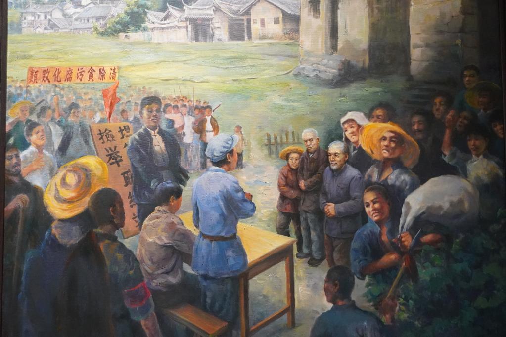 瑞金红井景区内的“中央苏区时期中国共产党纪检监察史”陈列馆里再现廉政运动的油画。新华社记者 姚子云 摄