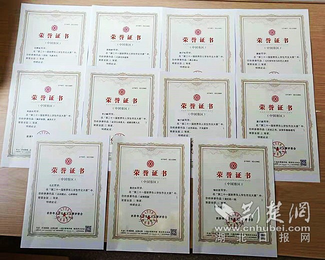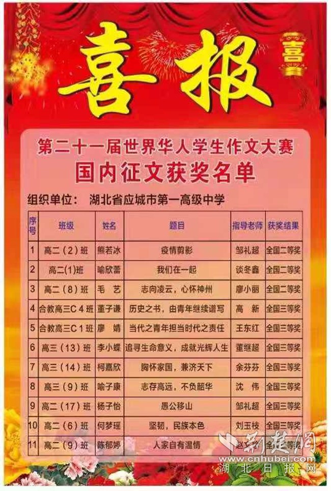 荆楚网(湖北日报网)讯(通讯员程国辉、孙丽蓉)4日9日,从应城市委统战部传来喜讯,在由中国侨联、全国台联、人民日报海外版、《快乐作文》杂志等共同主办的第二十一届世界华人学生作文大赛中,应城一中参赛师生喜获佳绩。其中,熊若冰等11名学生分获国家级二、三等奖,邹礼超等10名教师荣获“优秀指导教师奖”。