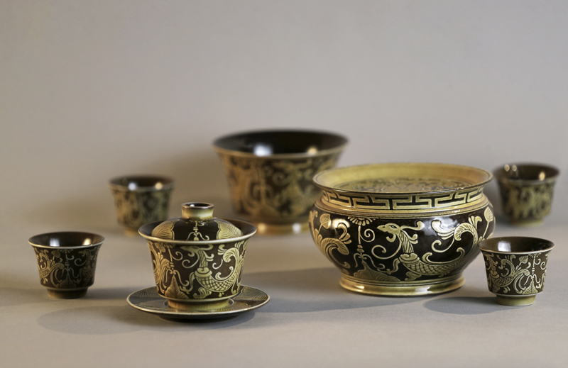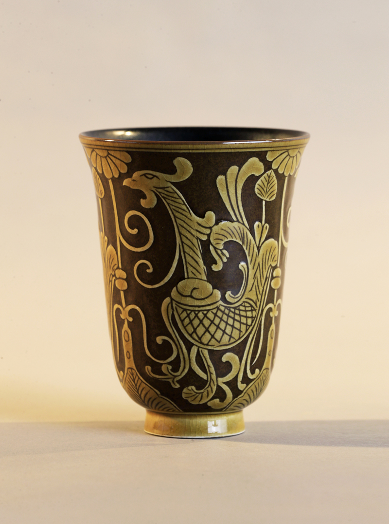 以手工拉坯成型,着以鳝鱼黄釉色,在器物表面剔花形成楚地传统代表凤纹装饰图案。