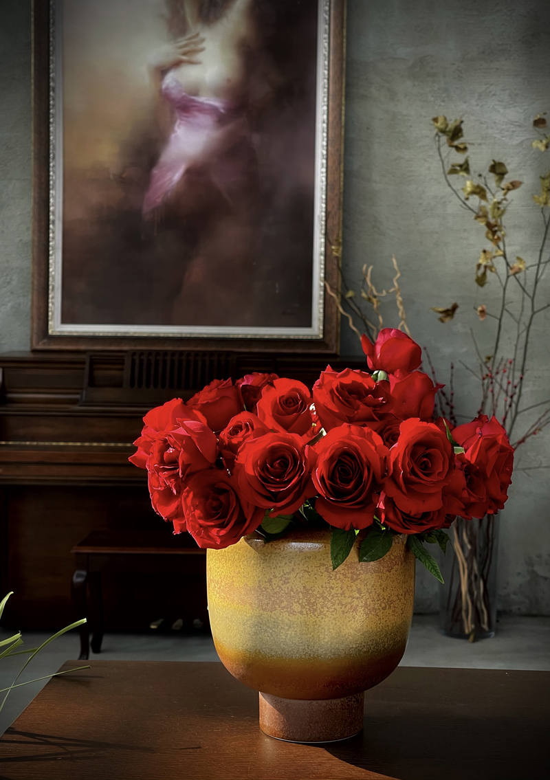 灵感来自于黄龙湖秋季的湖水幻化,采用传统的马口黄釉为容器主色调,紫金泥土色与之相配,充满秋的气息,极具生命律动的意境。