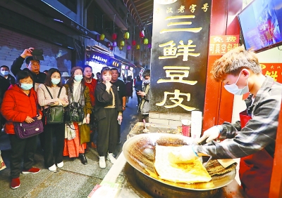 12日晚7时许,记者来到户部巷实地探访,宽敞明亮的街巷内熙熙攘攘、人声鼎沸。蔡林记热干面、华美汤包、老谦记豆丝等汉味老字号沿街矗立,各家美食店飘出阵阵香味,市民、游客一边逛街,一边品尝各类地道的汉味美食。街口的实时客流数据显示,当天进入户部巷的人流量超过2.1万人次。