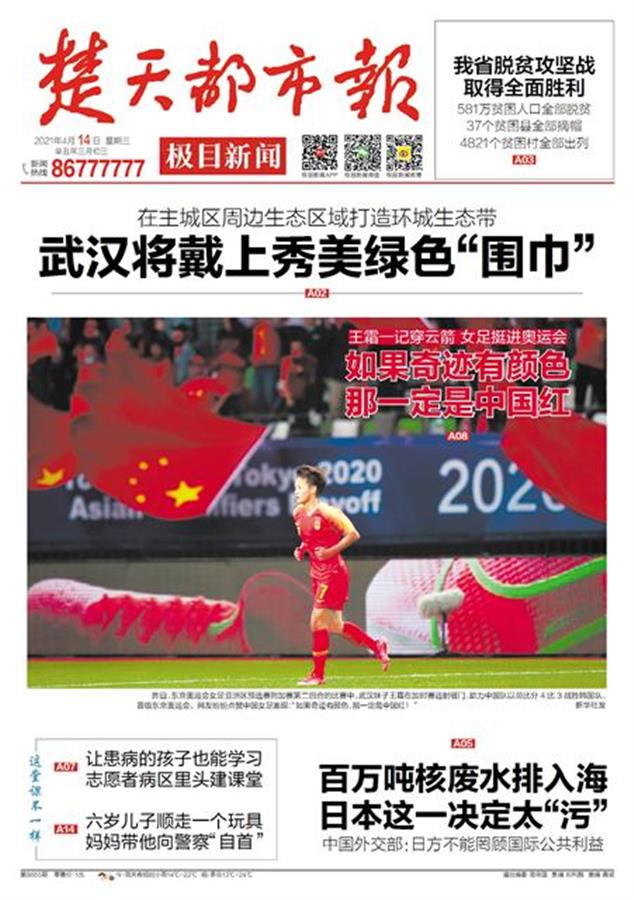 4月13日下午,东京奥运会女足亚洲区预选赛附加赛次回合决战在苏州奥体中心举行,亚洲足球小姐、武汉妹子王霜独进两球,助中国女足昂首挺进东京奥运,万千球迷欣喜若狂。14日,楚天都市报的重磅现场直击报道《月落乌啼霜满天 姑苏城外韩3:4》版面刷屏,成为全网女足冲奥报道中的亮点。