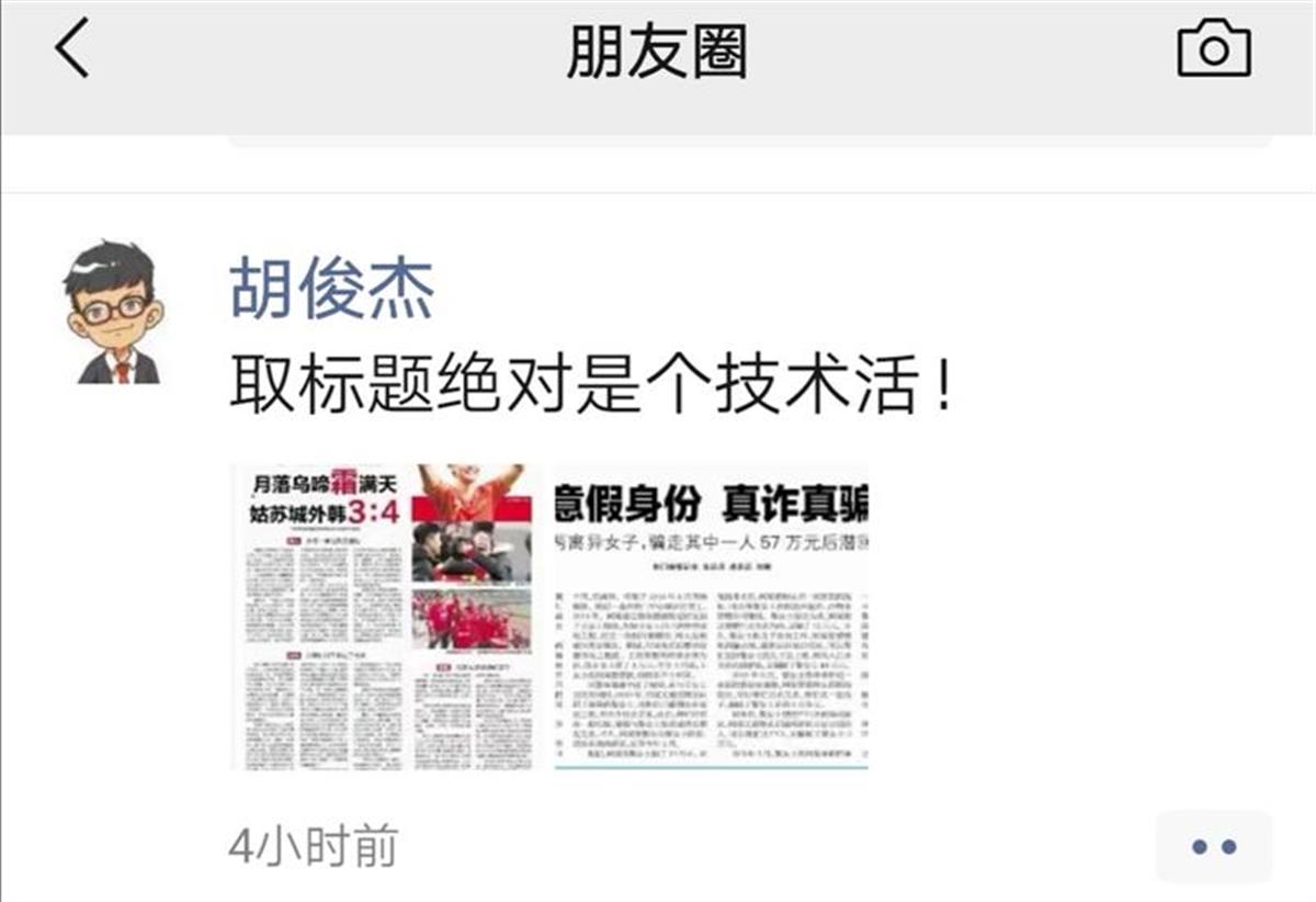 14日一早,《月落乌啼霜满天 姑苏城外韩3:4》版面刷屏网络和朋友圈,同时,头版大图配标题《如果奇迹有颜色,那一定是中国红》,十分醒目。众多媒体观察类自媒体转发并点赞,不少官媒同行也转发打CALL,小编看了,非常非常非常受用啊~~