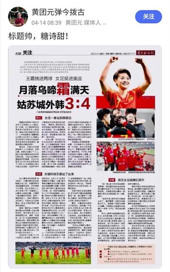 为了做好这场比赛的报道,楚天都市报极目新闻编辑部前后协作,值班总编辑、责任编辑、融媒体中心值班编辑等多位同事及时了解了赛况,为最后的报道呈现做准备。最后,值班老总结合网络评论,建议巧妙化用唐诗《枫桥夜泊》中的名句,把王霜、韩国队和比赛结果3:4、赛事地点等因素都嵌入标题。值班老总拍板,发!