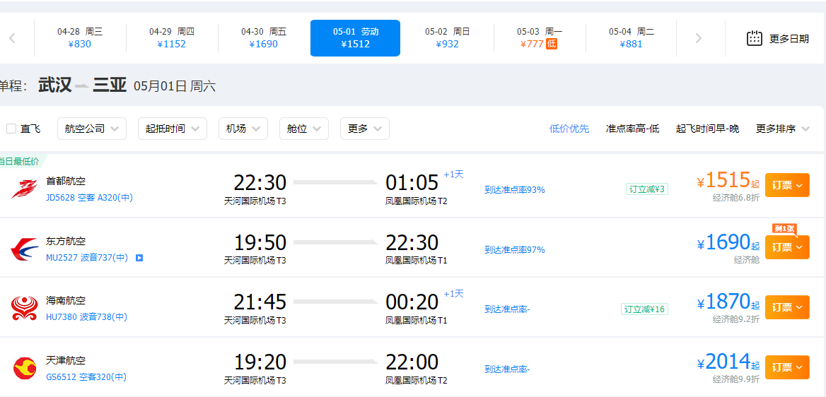 “五一”民航出行需求也十分旺盛。记者在网上售票平台查看到,受假期强劲出行需求拉动,热门线路机票价格大幅上涨。像武汉飞三亚最便宜要1515元起售,武汉飞成都940元起售,武汉飞厦门990元起售,武汉飞大连1180元起售,热门线路打折很少,还有的为全价售卖。