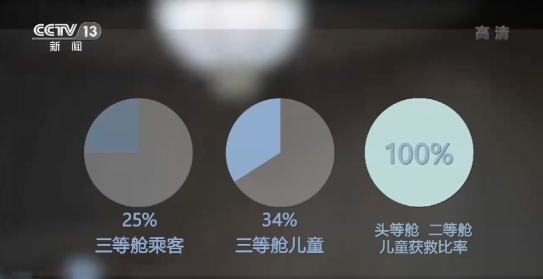 一份调查报告显示,泰坦尼克号头等舱乘客获救的比率为62%,二等舱乘客获救的比率为41%,两个仓位的儿童获救比率为100%。相比之下,三等舱乘客的获救比率只有25%,儿童的获救比率为34%。