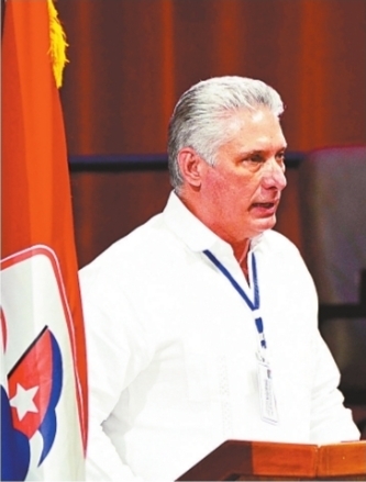 4月18日,迪亚斯-卡内尔在古巴首都哈瓦那举行的古巴共产党第八次全国代表大会上发言。