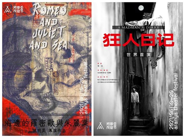 左:《海边的罗密欧与朱丽叶》海报,右:《狂人日记》海报 阿那亚戏剧节组委会供图