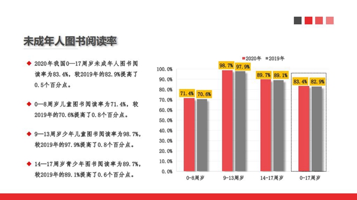 调查显示,0—17周岁未成年人图书阅读率、阅读量均高于上年。从图书阅读率来看,2020年我国0—17周岁未成年人图书阅读率为83.4%,较2019年的82.9%提高了0.5个百分点。在图书阅读量方面,2020年我国0—17周岁未成年人的人均图书阅读量为10.71本,比2019年的10.36本增加了0.35本。