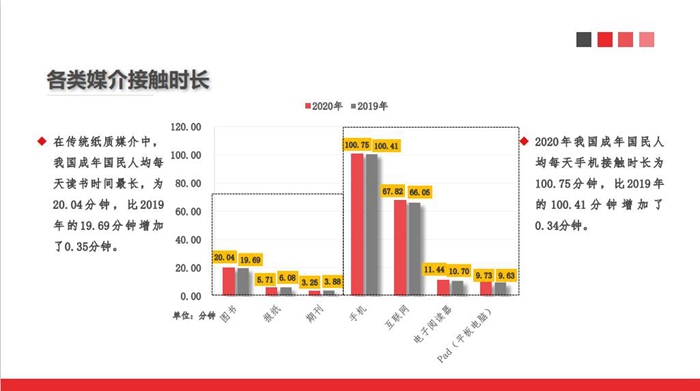 此外,从人们对不同媒介接触时长来看,成年国民人均每天手机接触时间最长。2020年我国成年国民人均每天手机接触时长为100.75分钟,比2019年的100.41分钟增加了0.34分钟。在传统纸质媒介中,2020年我国成年国民人均每天读书时间最长,为20.04分钟,比2019年的19.69分钟增加了0.35分钟。