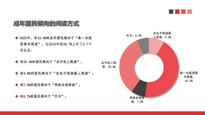 4月23日,第十八次全国国民阅读调查主要发现在北京公布。数据显示,2020年我国成年国民包括书报刊和数字出版物在内的各种媒介的综合阅读率为81.3%,国民图书阅读率为59.5%,数字化阅读方式接触率为79.4%。成年国民人均纸质图书阅读量为4.70本,高于2019年的4.65本。有声阅读规模持续扩大,三成以上的成年国民有听书习惯。