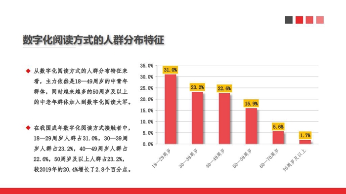 从数字化阅读方式的人群分布特征来看,主力依然是18—49周岁的中青年群体,但值得关注的是,越来越多的50周岁及以上的中老年群体加入到数字化阅读大军。