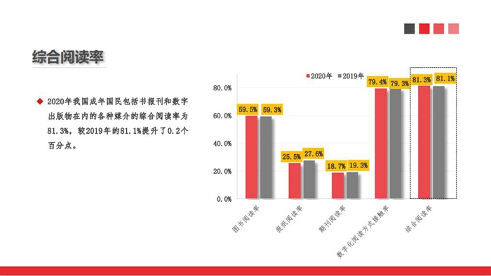 调查显示,2020年我国成年国民包括书报刊和数字出版物在内的各种媒介的综合阅读率为81.3%,较2019年的81.1%提升了0.2个百分点。