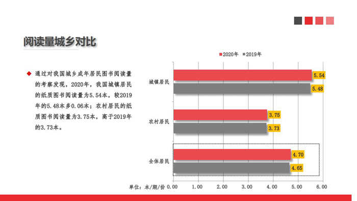 通过对我国城乡成年居民图书阅读量的考察发现,2020年,我国城镇居民的纸质图书阅读量为5.54本,较2019年的5.48本多0.06本;农村居民的纸质图书阅读量为3.75本,高于2019年的3.73本。