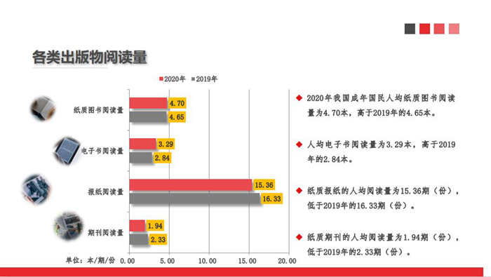 2020年,我国成年国民人均纸质图书阅读量为4.70本,高于2019年的4.65本。人均电子书阅读量为3.29本,高于2019年的2.84本。