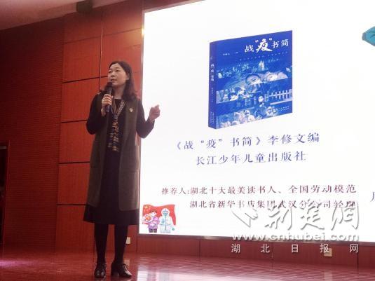 全国劳动模范、湖北省十大最美读书人、湖北省新华书店(集团)有限公司武汉市分公司经理周怡代表集团出席本次活动颁奖并现场推荐了长江少年儿童出版社的《战“疫”书简》一书,66封抗疫书信后的故事引发了台下嘉宾师生的深深共鸣,对抗疫工作中迎难而上的共产党员和人民群众表达了自己的敬意。