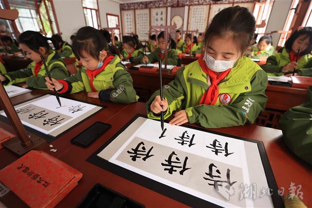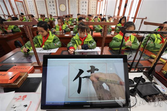 4月26日,在襄阳市米公小学智慧书法教室内,三(1)班的学生们在交互式数字临摹系统上学习书法。米公小学的是所百年老校,该校今年投资70多万元,建设有交互式数字临摹系统的智慧书法教室和教师书法教室。智慧书法教室是在保留传统笔墨纸、传统书法临摹练习的前提下,结合多媒体、交互技术、智能硬件等数字化信息技术,提供丰富的课件、示范视频等教学资源,里面包含了上百本名家字帖和讲解视频,引领孩子们感受中华传统艺术的独特魅力,提高其学习书法的兴趣和效率。(视界网 王虎 摄)