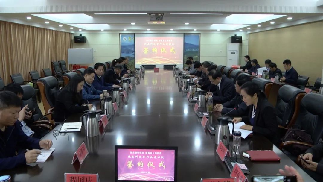 签约仪式上,省农科院总农艺师胡定金与邹松明签订院县科技合作共建协议,省农科院果茶所党委书记陈登松同湖北七仙红园区管理服务有限公司、管氏茶叶有限责任公司签订产业合作协议。