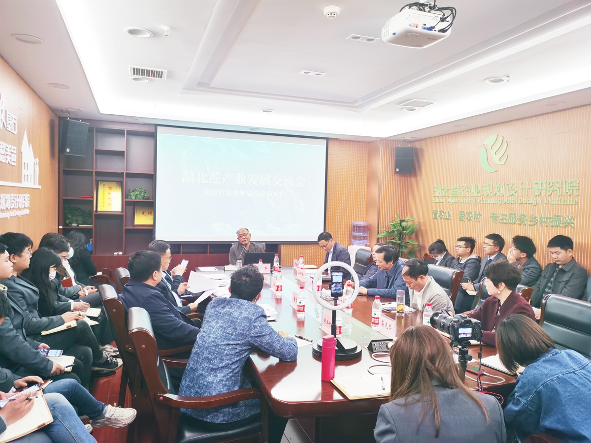 4月12日,湖北莲产业发展交流会在湖北省农业规划设计研究院举行。湖北省农科院研究员何建军、华中科技大学教授晏明春和洪湖市及相关企业代表30多人参与交流。(通讯员 张胜 摄)