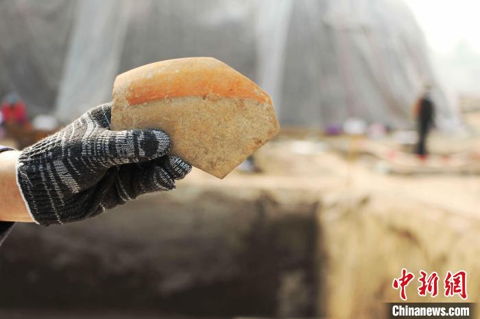 资料图:探访山东菏泽汉墓群,考古人员展示出土的红顶钵碎片。 赵晓 摄