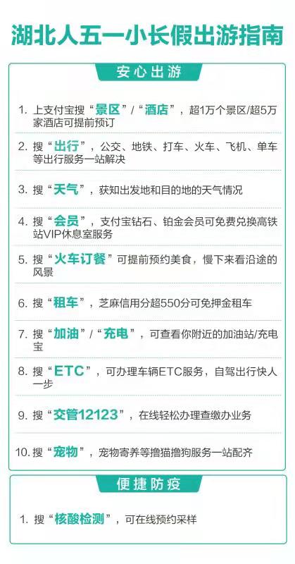 此外,支付宝也针对五一出游提供了景区、出行等一站式服务和礼包,湖北人只要上支付宝搜,就能获得相应的出行服务和优惠。