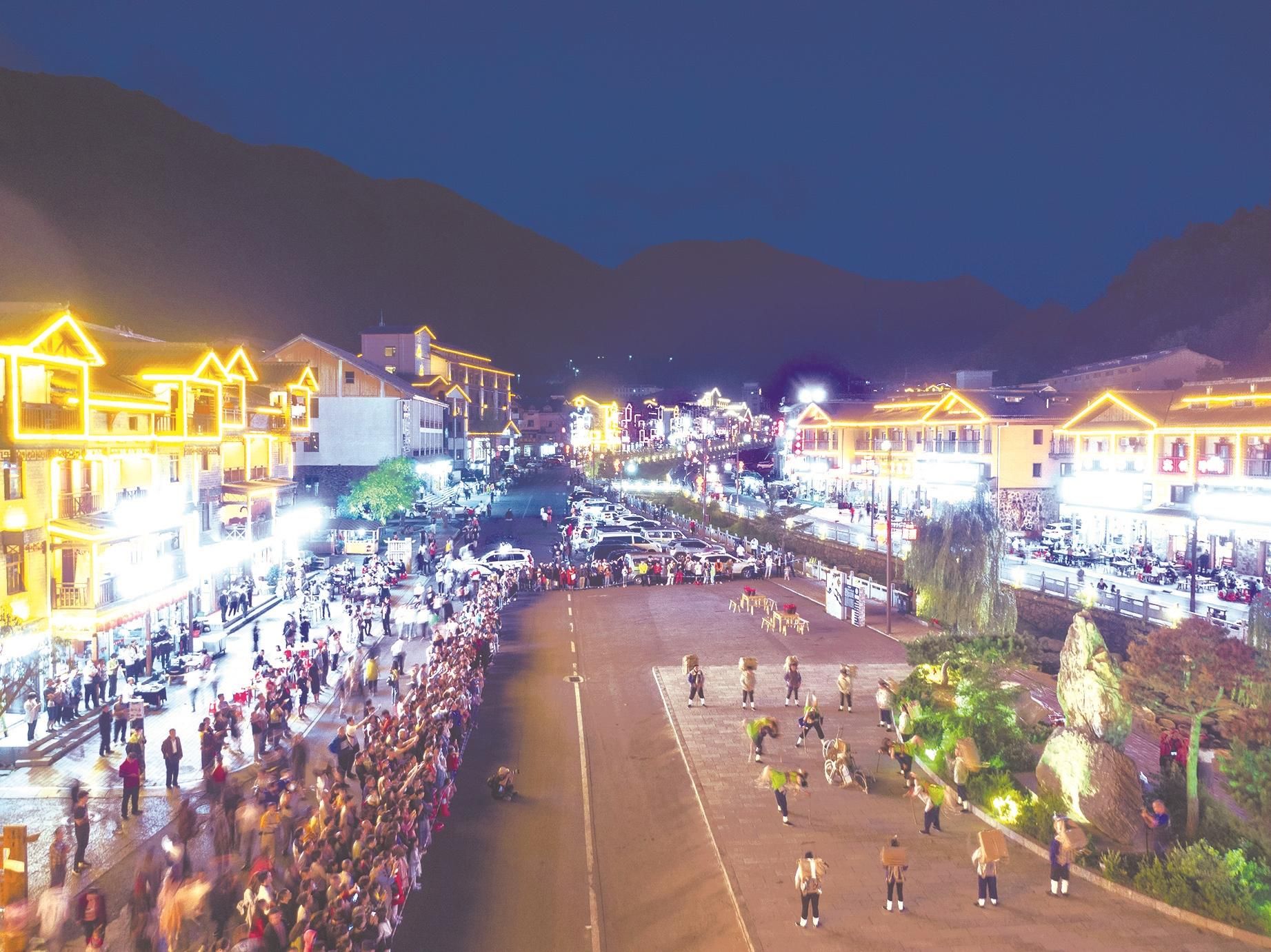 走在大九湖坪阡古镇,吊廊、翘檐,土家风格的楼房鳞次栉比。街道上,游人如织,热闹非凡。