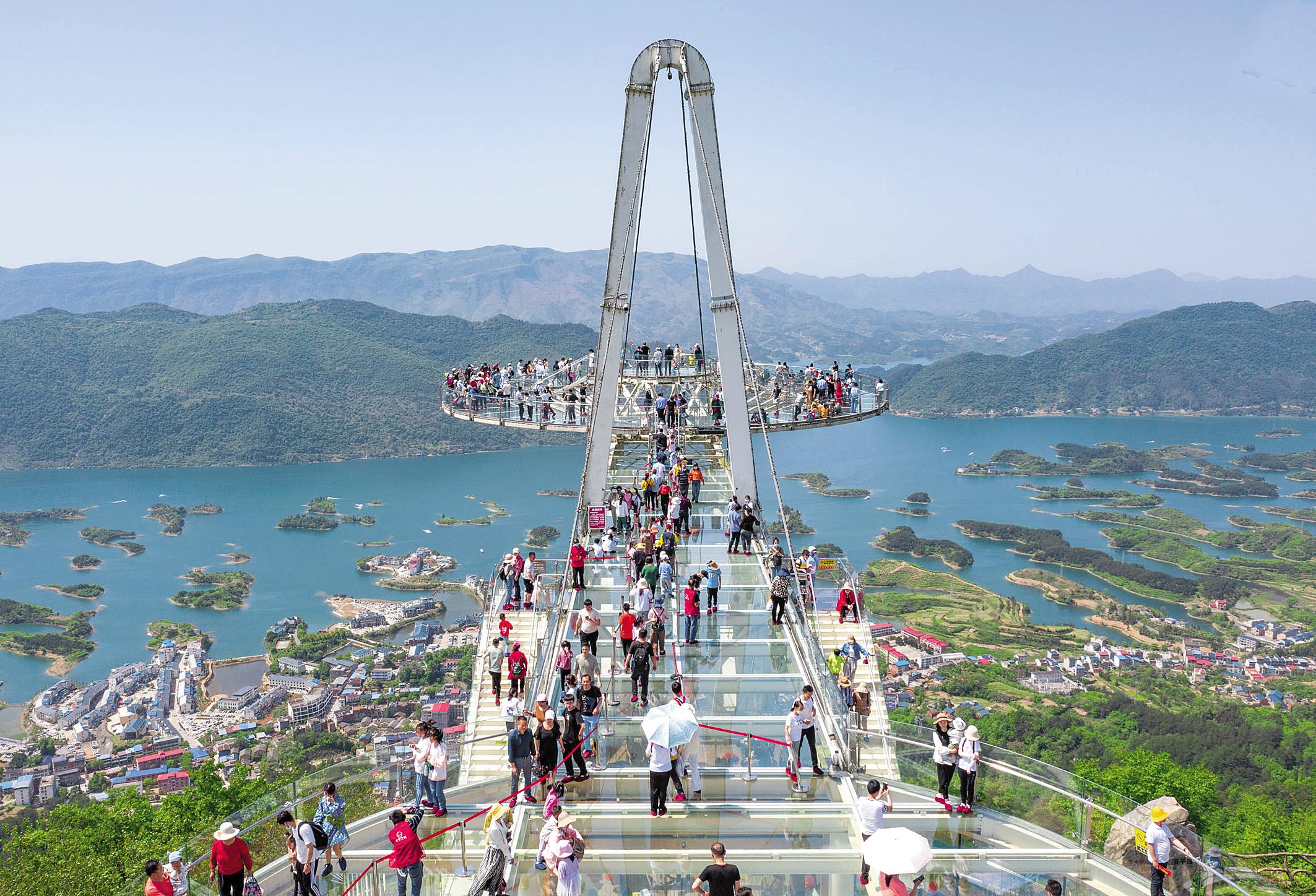 5月1日,阳新县天空之城景区游人如织,游客纷纷登上“天空之镜”玻璃观景平台欣赏仙岛湖风光。 (湖北日报全媒记者 薛婷 通讯员 戴璐 徐巧 摄)
