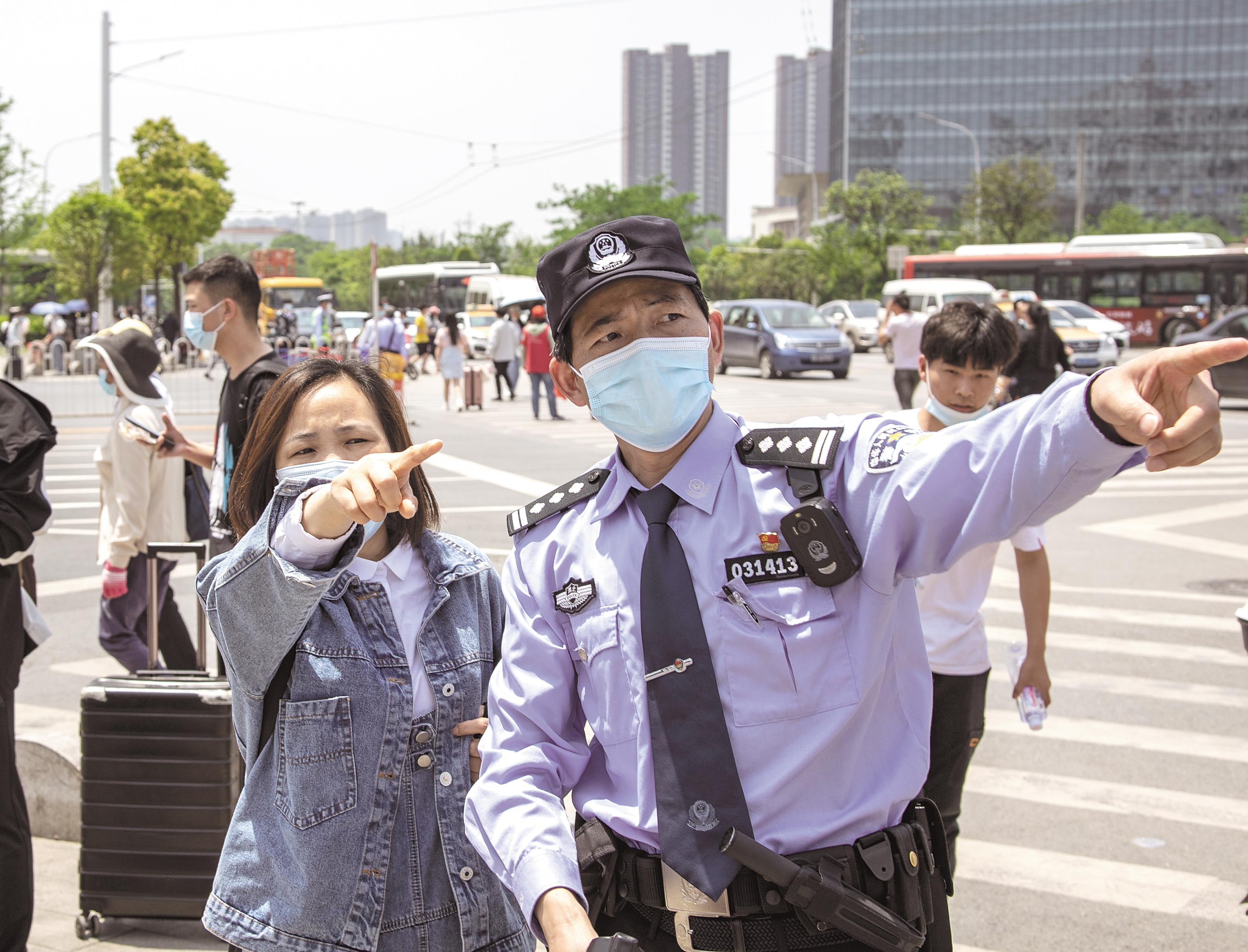 5月1日,武汉市宏基客运站外,武昌区公安分局的民警、辅警疏导进站客流,提醒旅客戴口罩。 (湖北日报全媒记者 魏铼 通讯员 应后威 孙逊 摄)