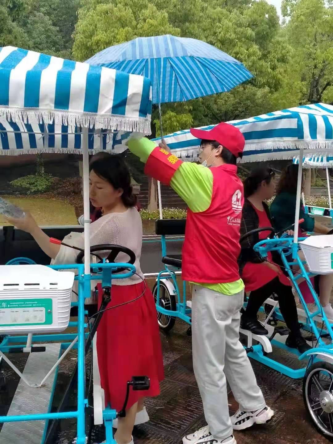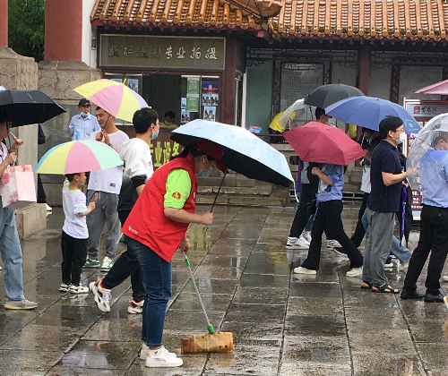 景区出口处离户外骑行车停车点大概三四百米远,志愿者肖洋、乔文洁正在协助工作人员引导游客进出。注意到停车点地方小,游客聚在一起躲雨不便,肖洋和乔文洁拿起自己的雨伞跑了过去。