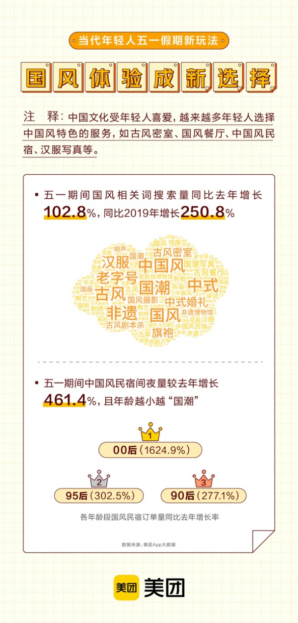 数据显示,“五一”期间在美团App上,“国潮”“国风”“中国风”“古风”“中式”“非遗”“老字号”等关键词的搜索量同比去年增长102.8%,同比2019年增长250.8%。有趣的是,年龄越小越热爱“国潮”。在中国风特色民宿消费增长数据中,“00后”中国风特色民宿订单量增长速度最快,同比去年增长达到1624.9%,95后和90后也分别增长302.5%、277.1%。