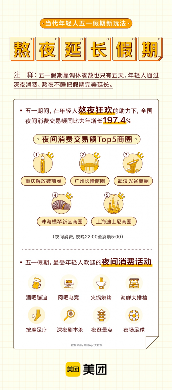长江日报5月6日讯 5月6日,美团App发布“五一”假期消费相关数据,以22时至凌晨5时的夜间消费订单量数据来看,90后、95后和00后成为夜间消费的主力军,武汉年轻人最多的光谷商圈成为全国夜消费排名前三的城市。