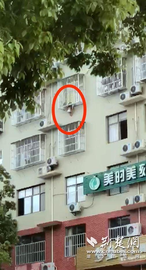 消防救援人员到达现场后,看到一位男子紧贴在居民房六楼防盗窗外,一只手死死抓住防盗窗,另一只手托着正在嚎啕大哭的儿童。楼下目击者称,好心男子已经坚持了10多分钟。