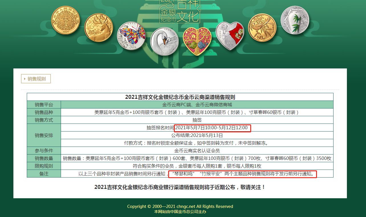 中国金币网显示,2021吉祥文化金银纪念币的销售平台为金币云商PC端、金币云商微信商城。销售方式为抽签。