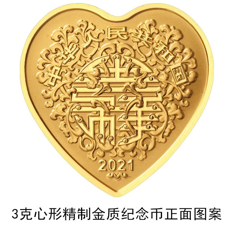据中国人民银行官网消息,人民银行自5月9日起发行2021吉祥文化金银纪念币一套。该套金银纪念币共7枚,其中金质纪念币3枚,银质纪念币4枚,均为中华人民共和国法定货币。其中,3克心形金质“琴瑟和鸣”纪念币和30克心形银质“琴瑟和鸣”纪念币5月20日发行。