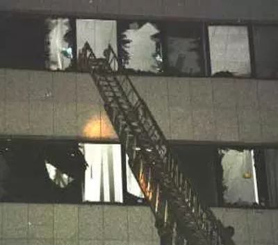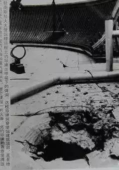 △图为中国驻南联盟大使馆楼顶被北约导弹击中后留下的弹洞。这枚导弹洞穿使馆建筑顶部,直至地下室。
