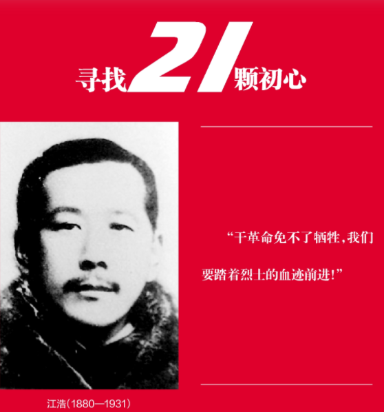 江浩早年跟随孙中山参加革命,是同盟会会员,官至中华民国国会参议院议员。加入中国共产党后,他把大部分收入交给我党作为活动经费,安守清贫,还甘冒灭门之险,把自家当作党的地下活动据点。