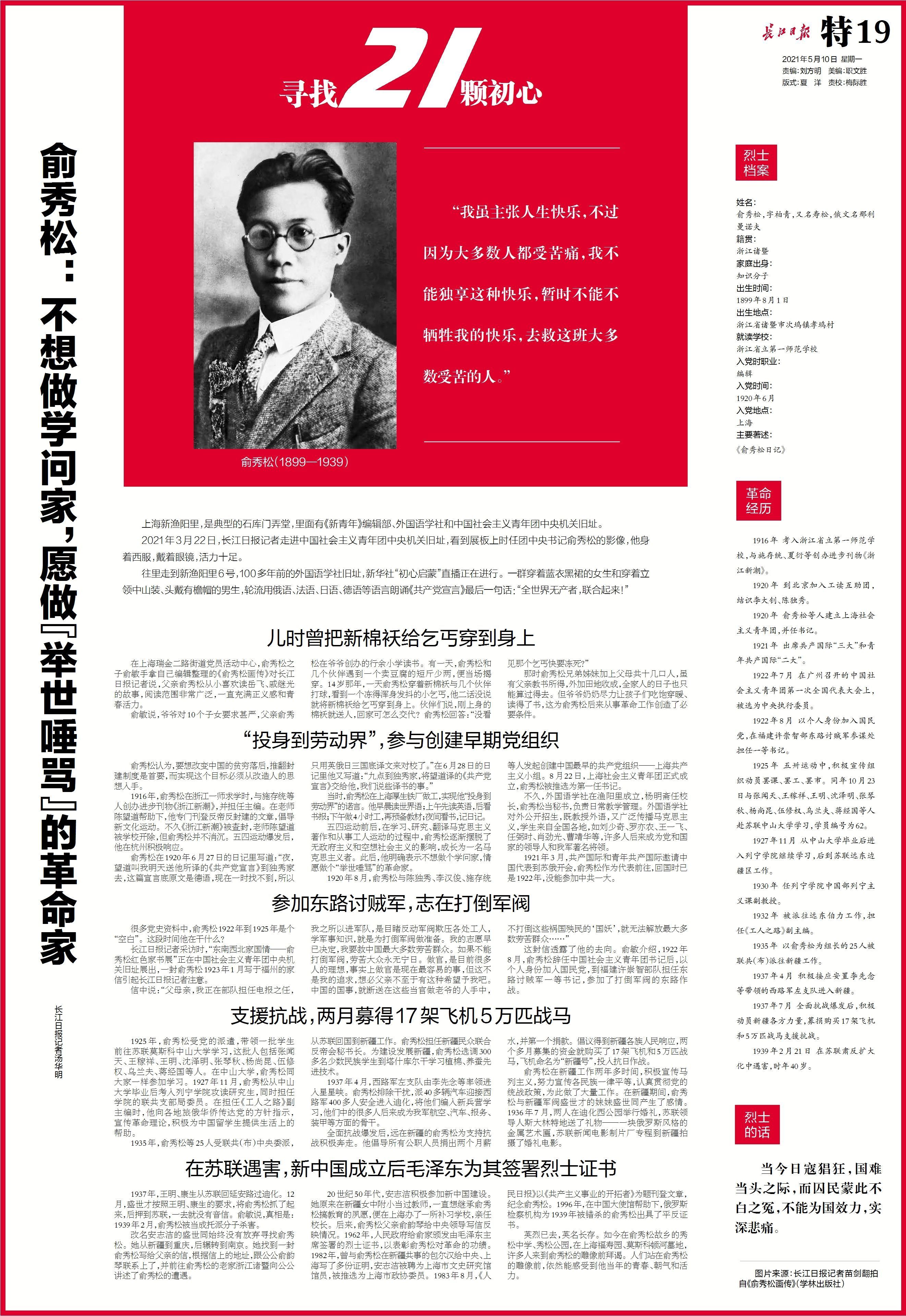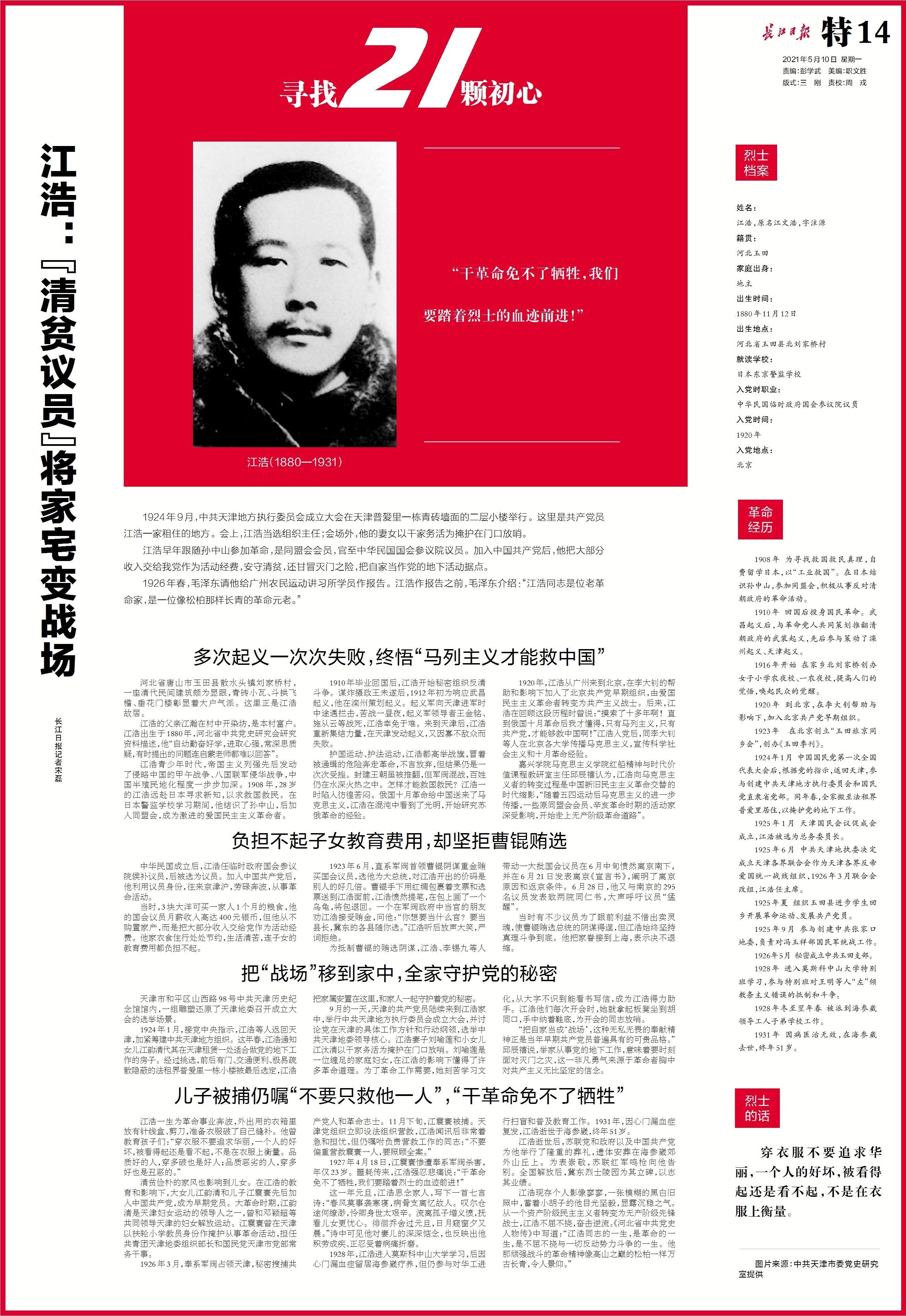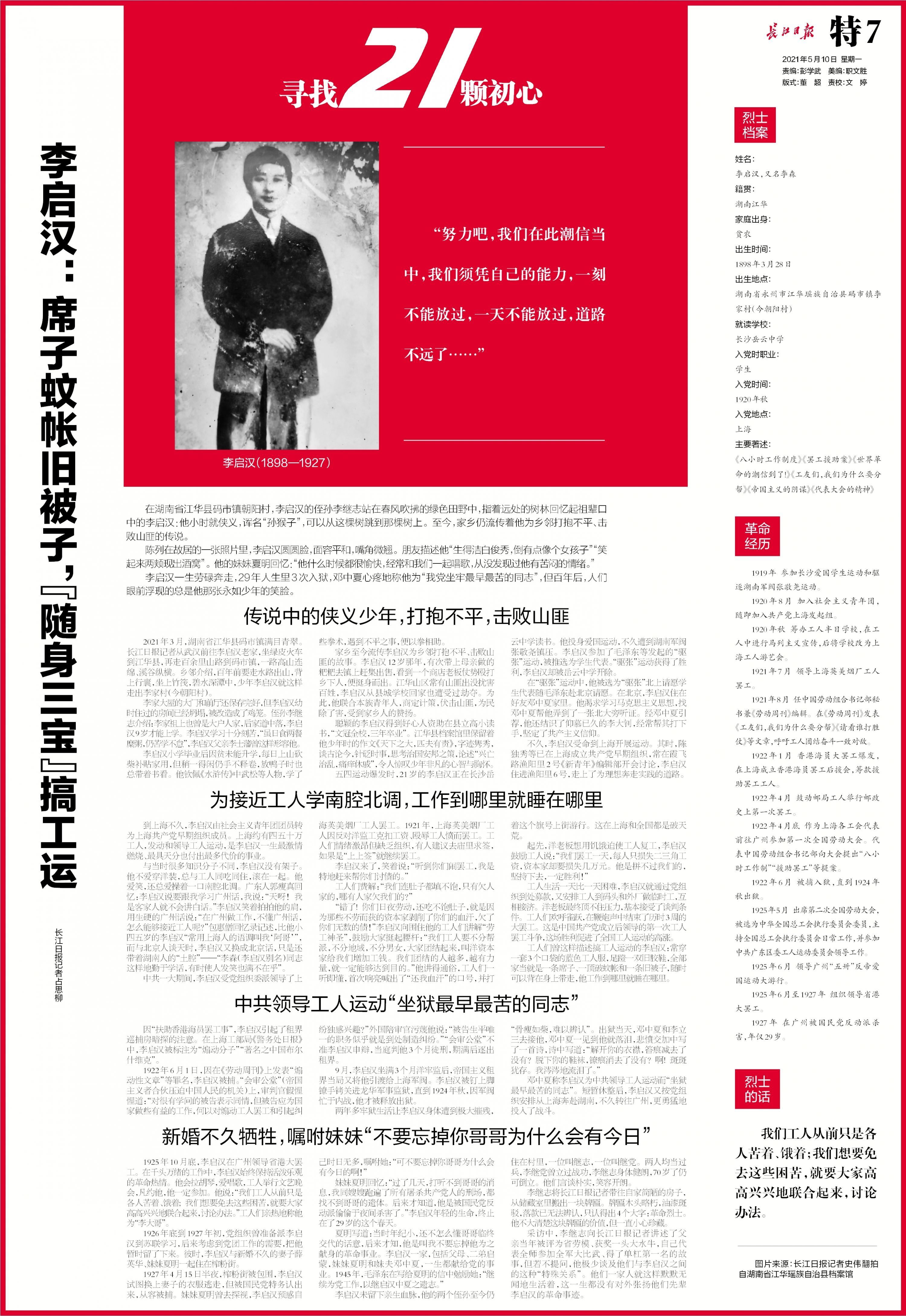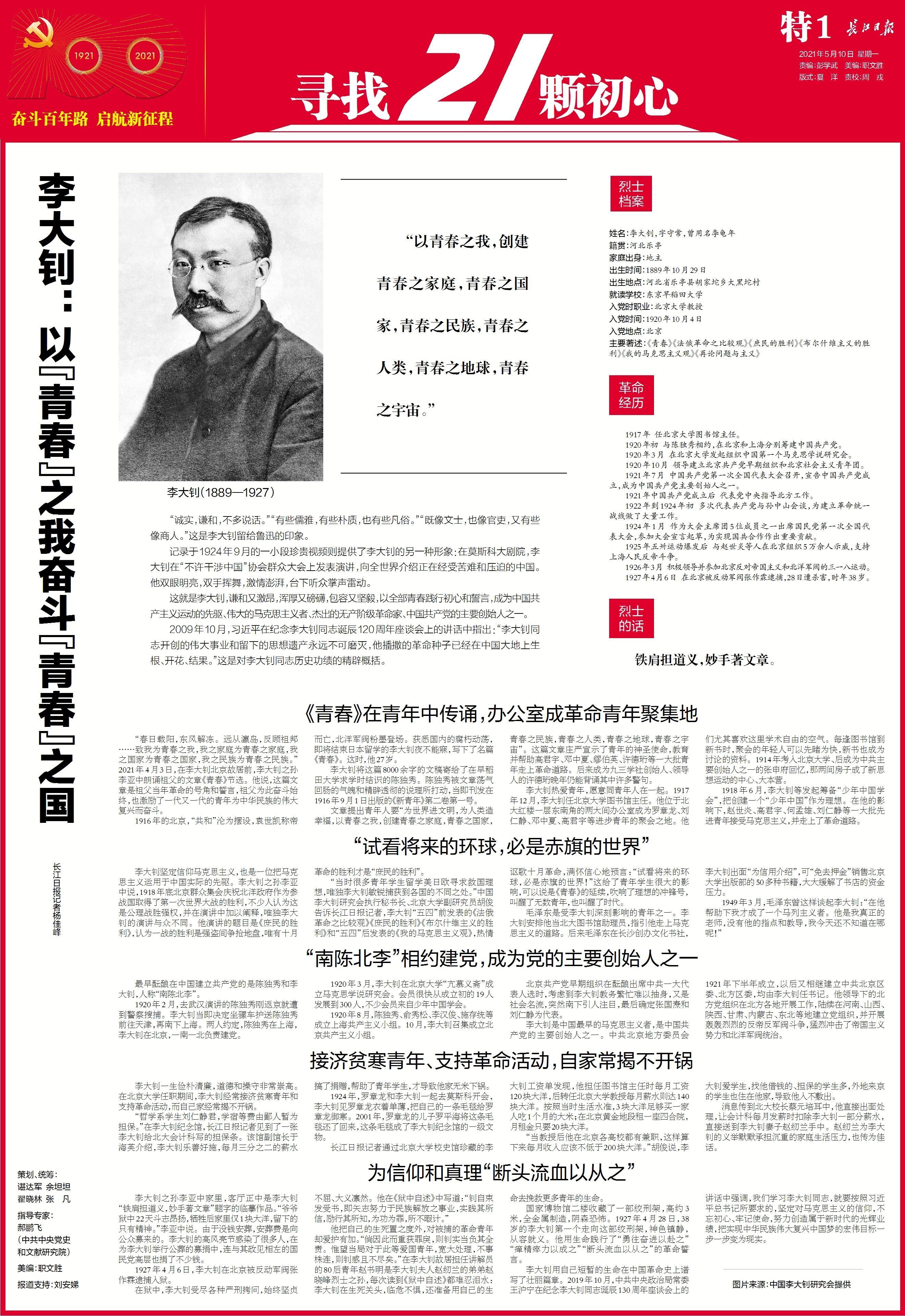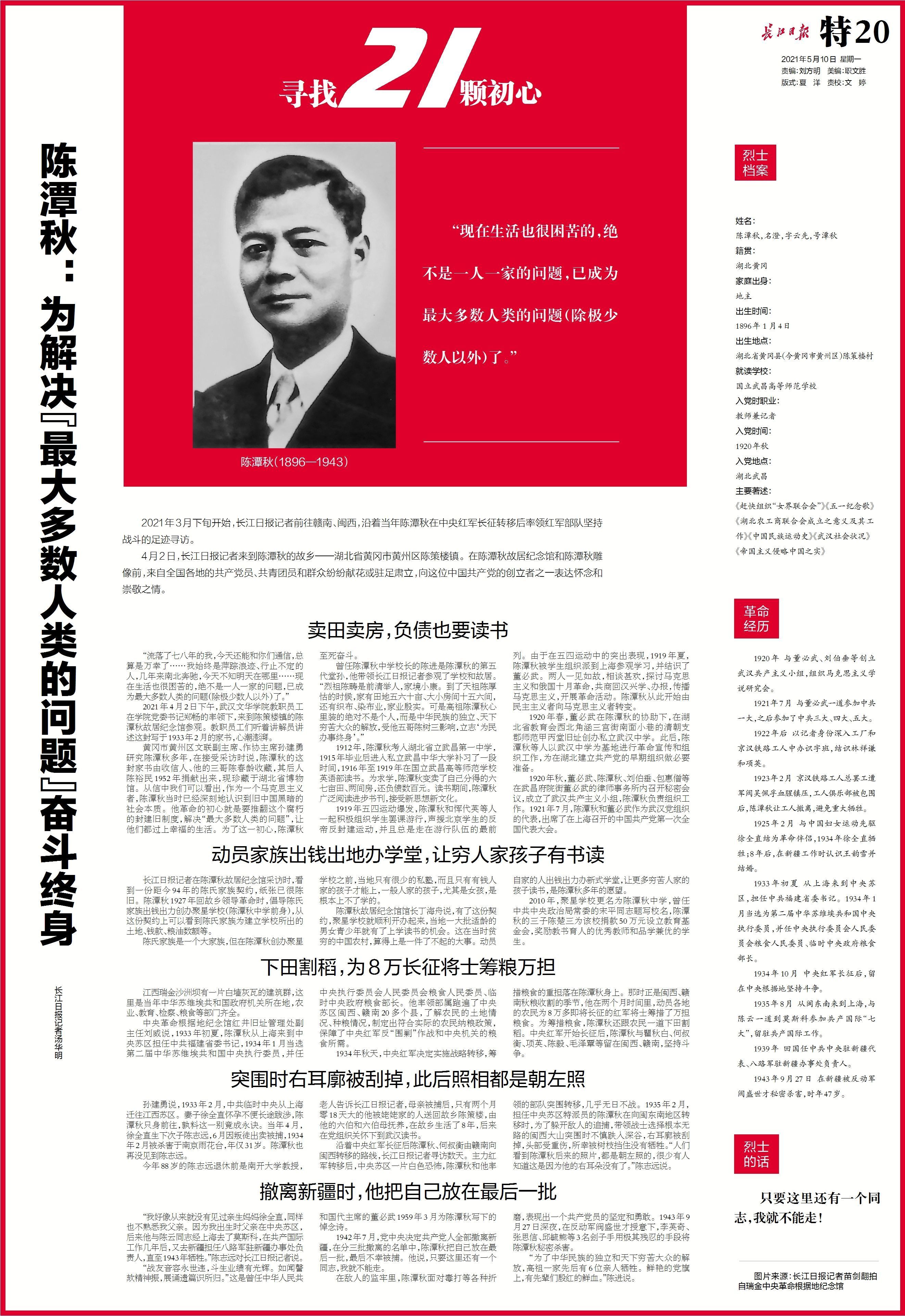 长江日报今日推出20版特刊《寻找21颗初心》,缅怀先烈,赓续共产党人精神血脉,汲取前行力量。