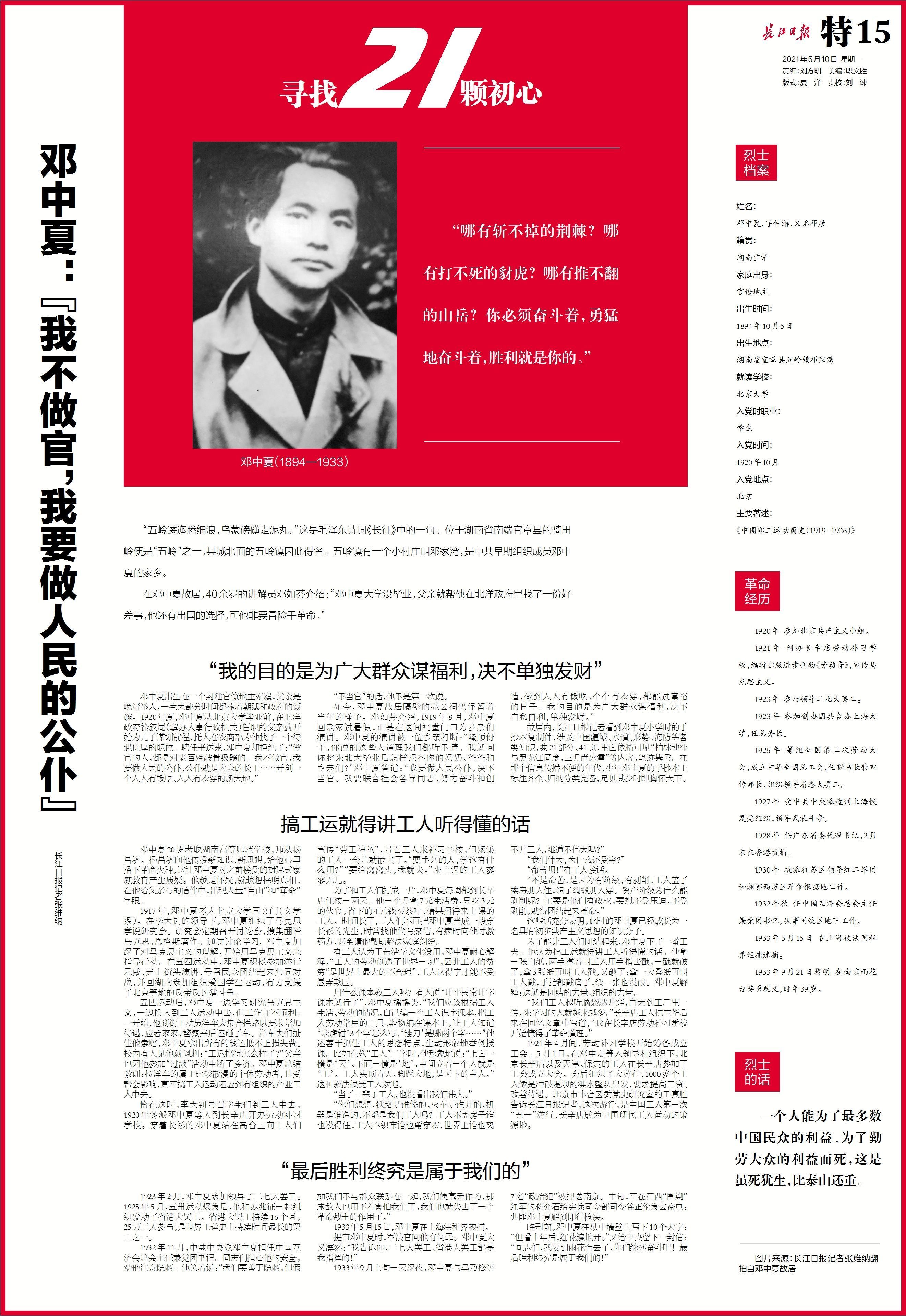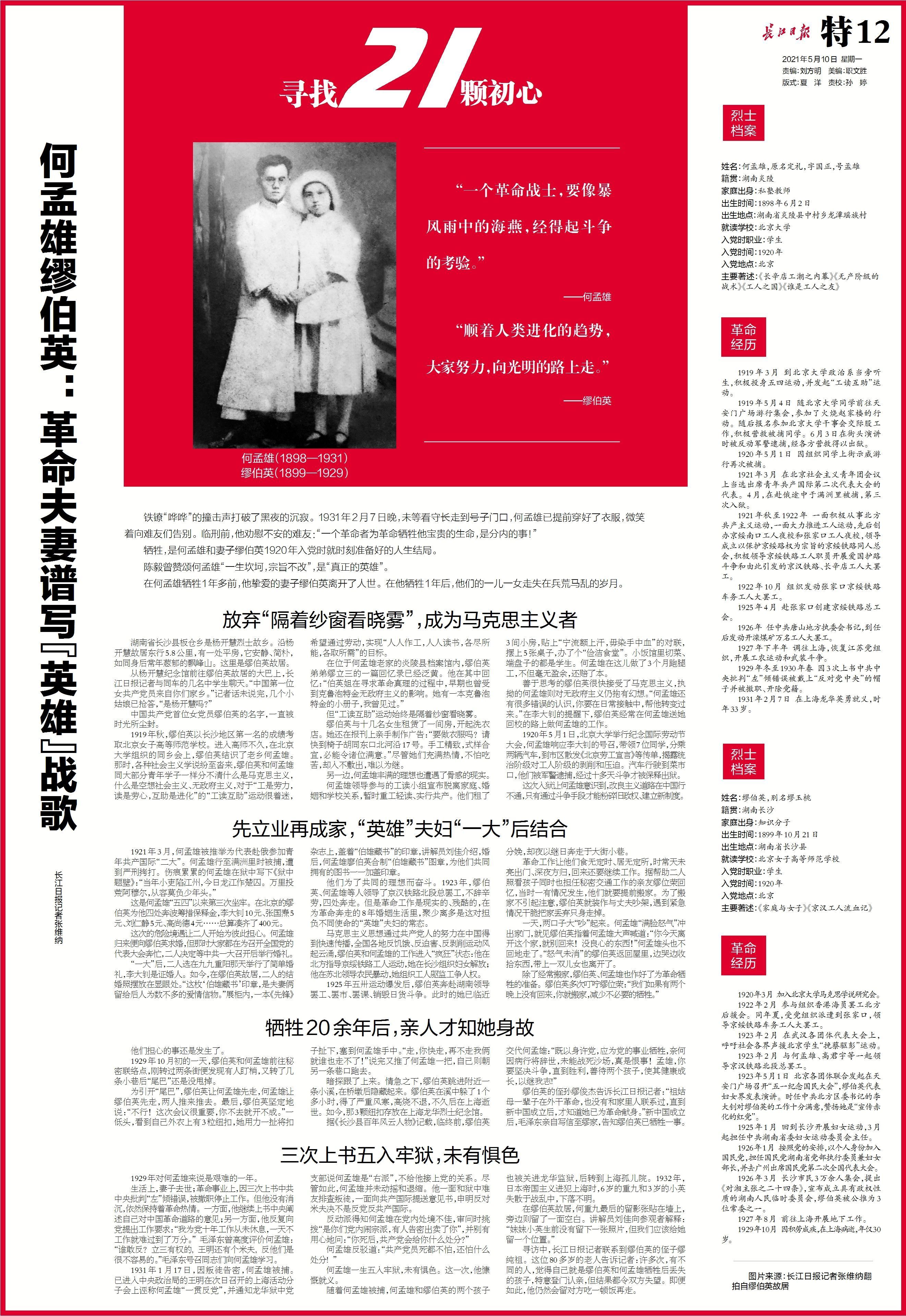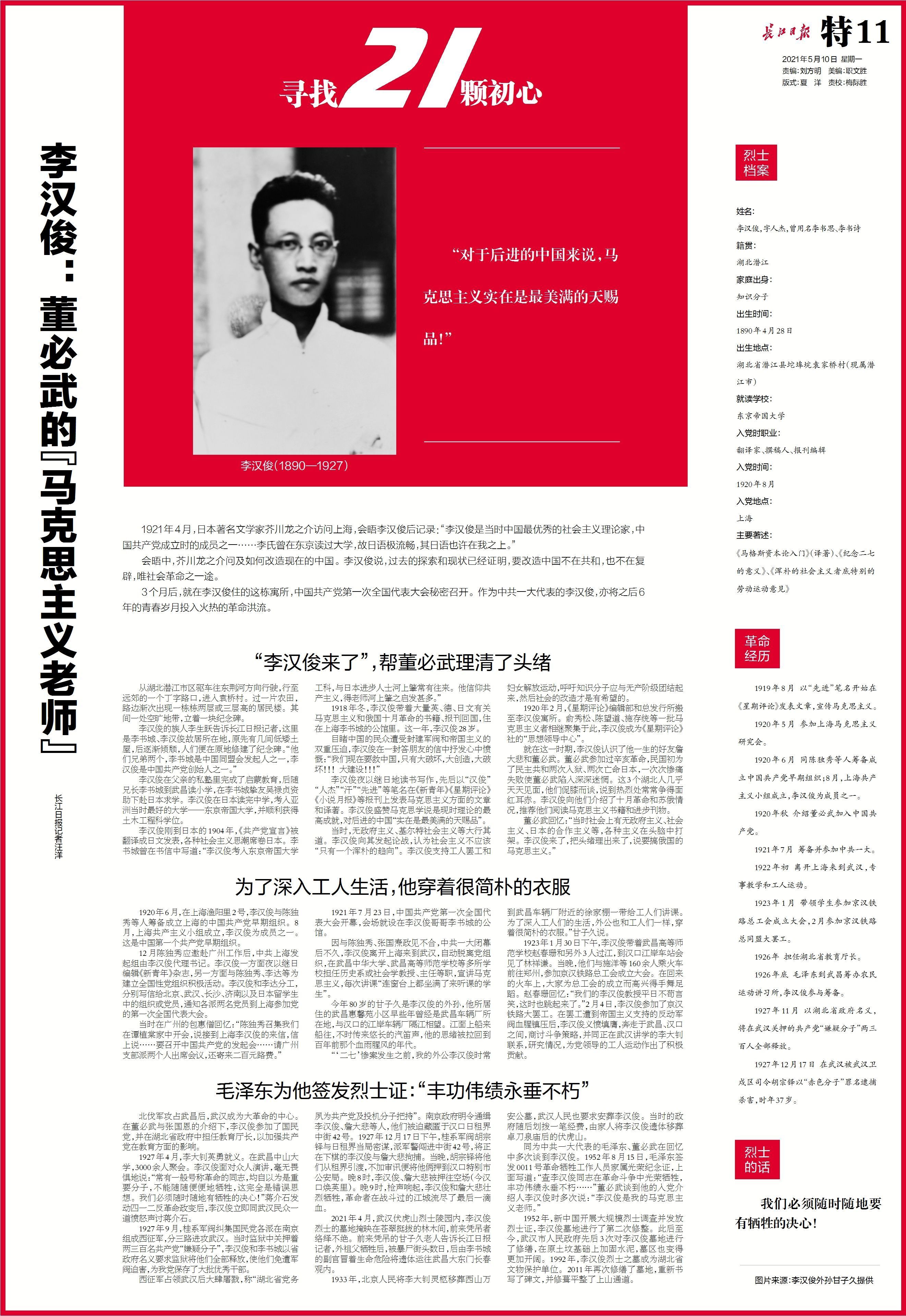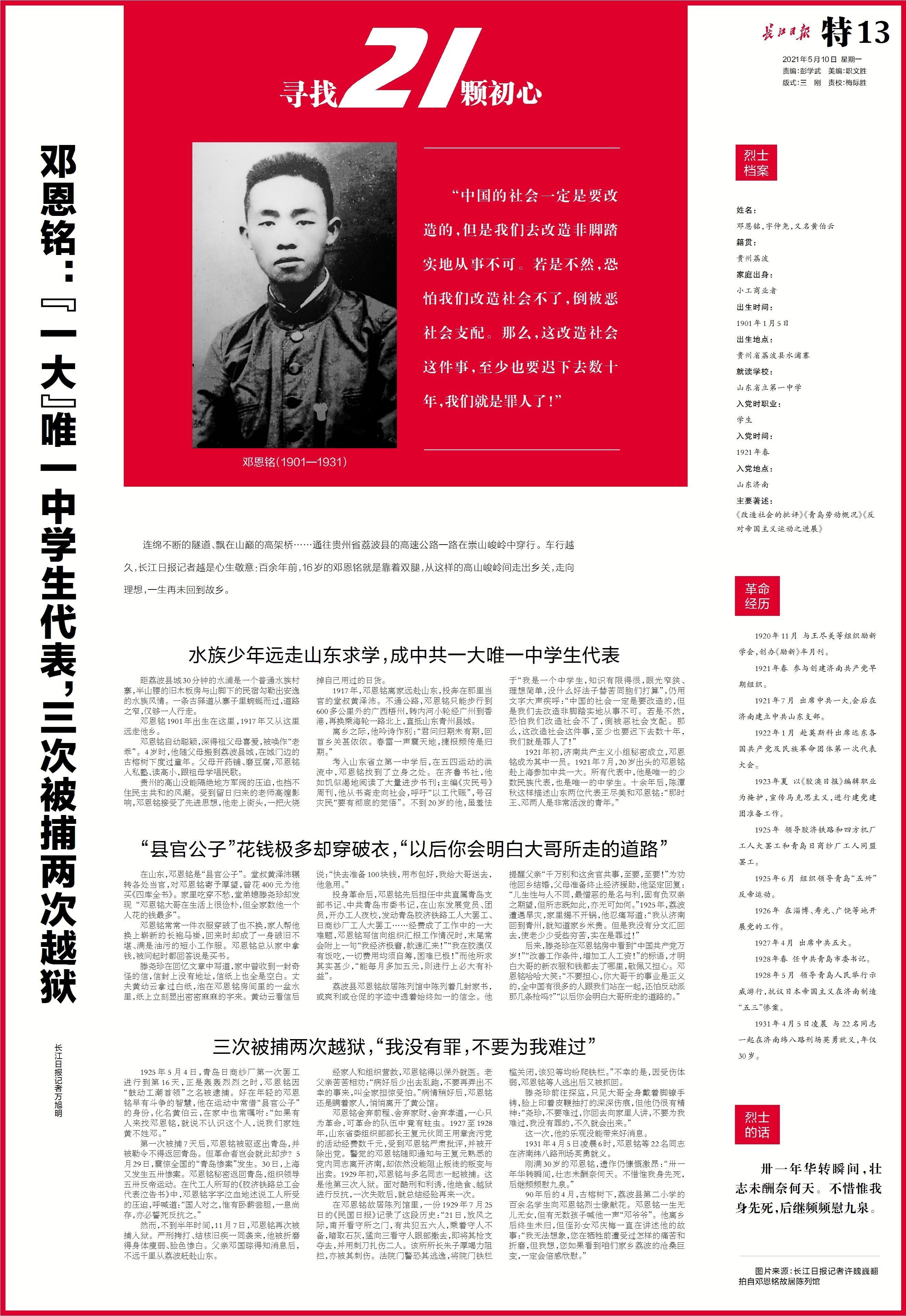 长江日报今日推出20版特刊《寻找21颗初心》,缅怀先烈,赓续共产党人精神血脉,汲取前行力量。