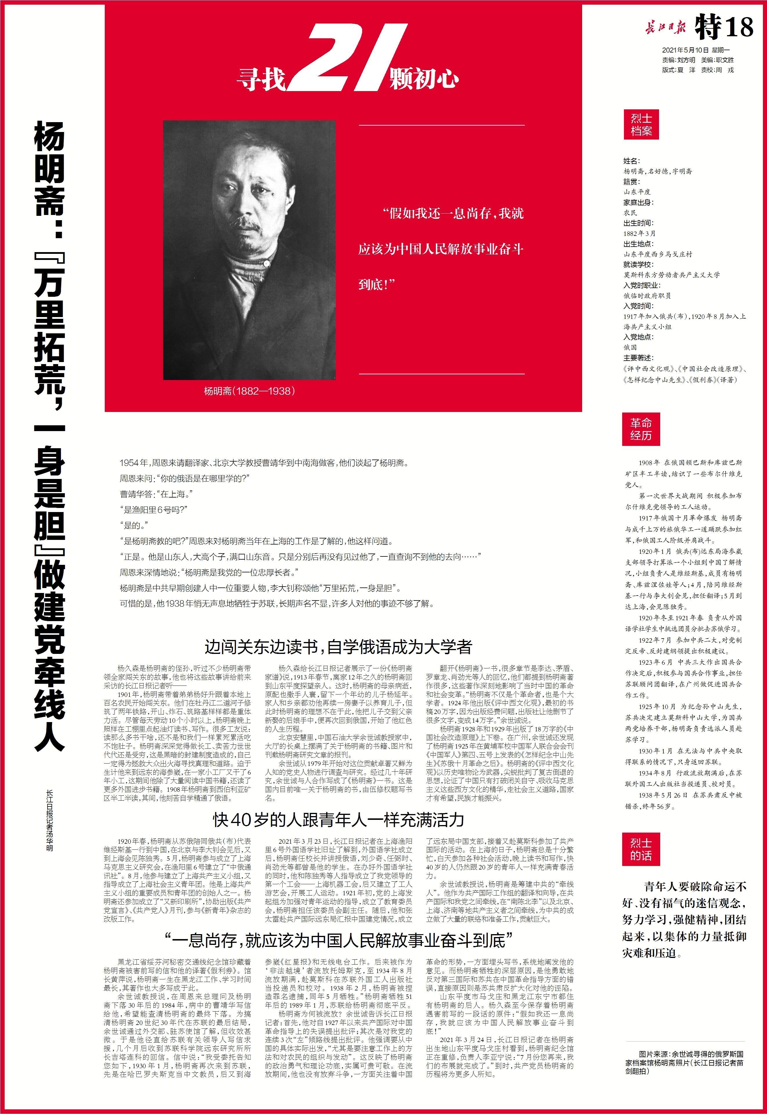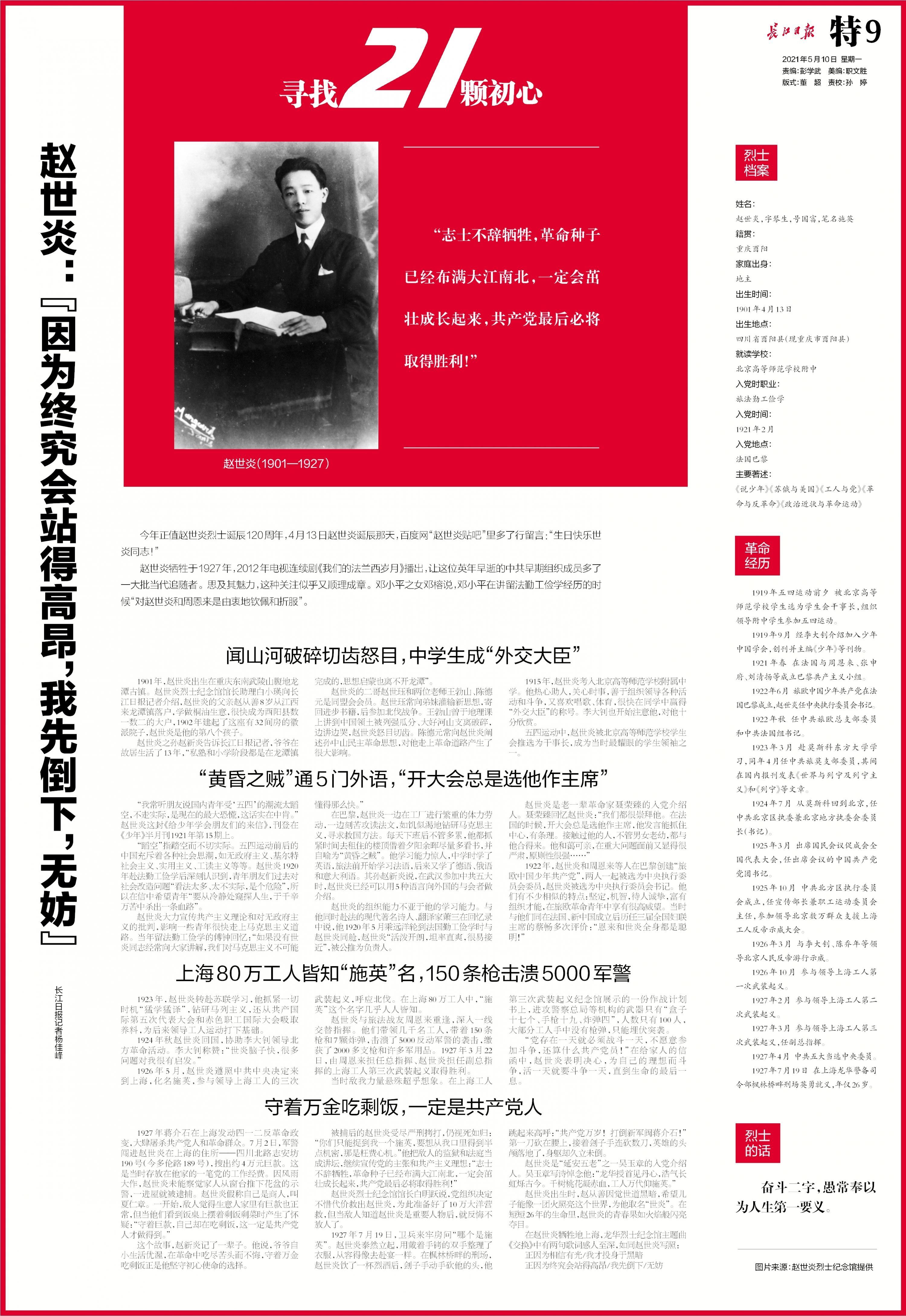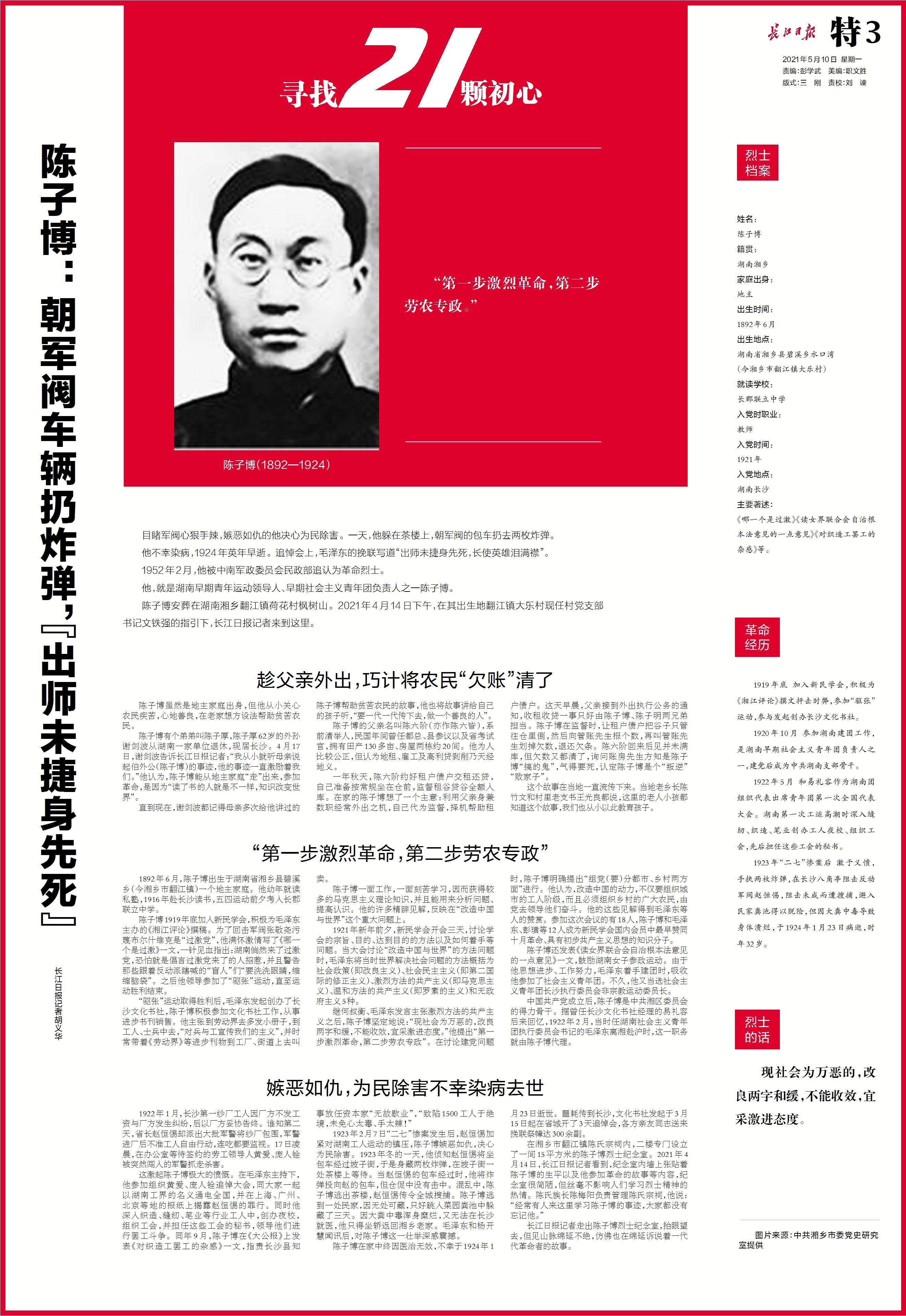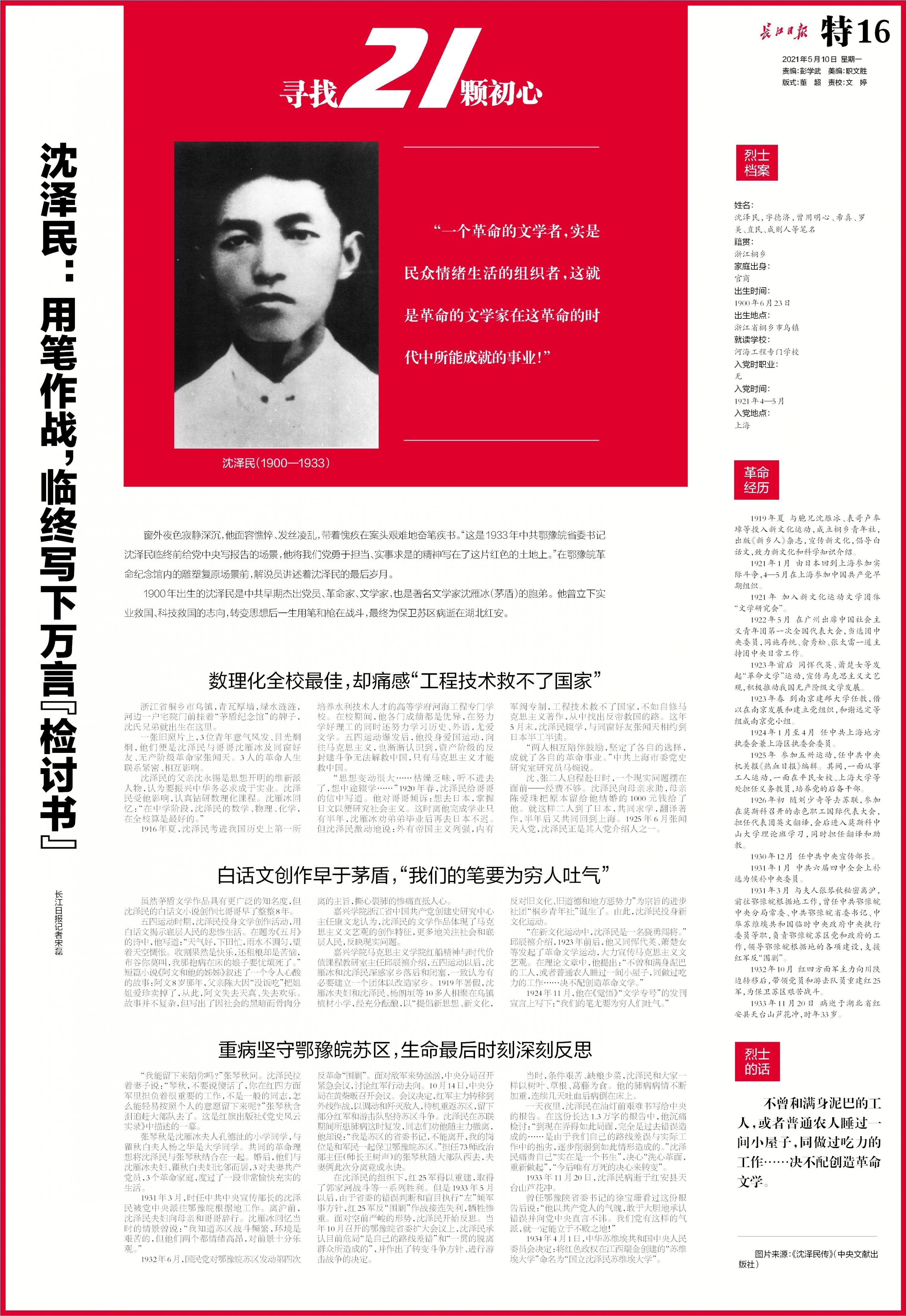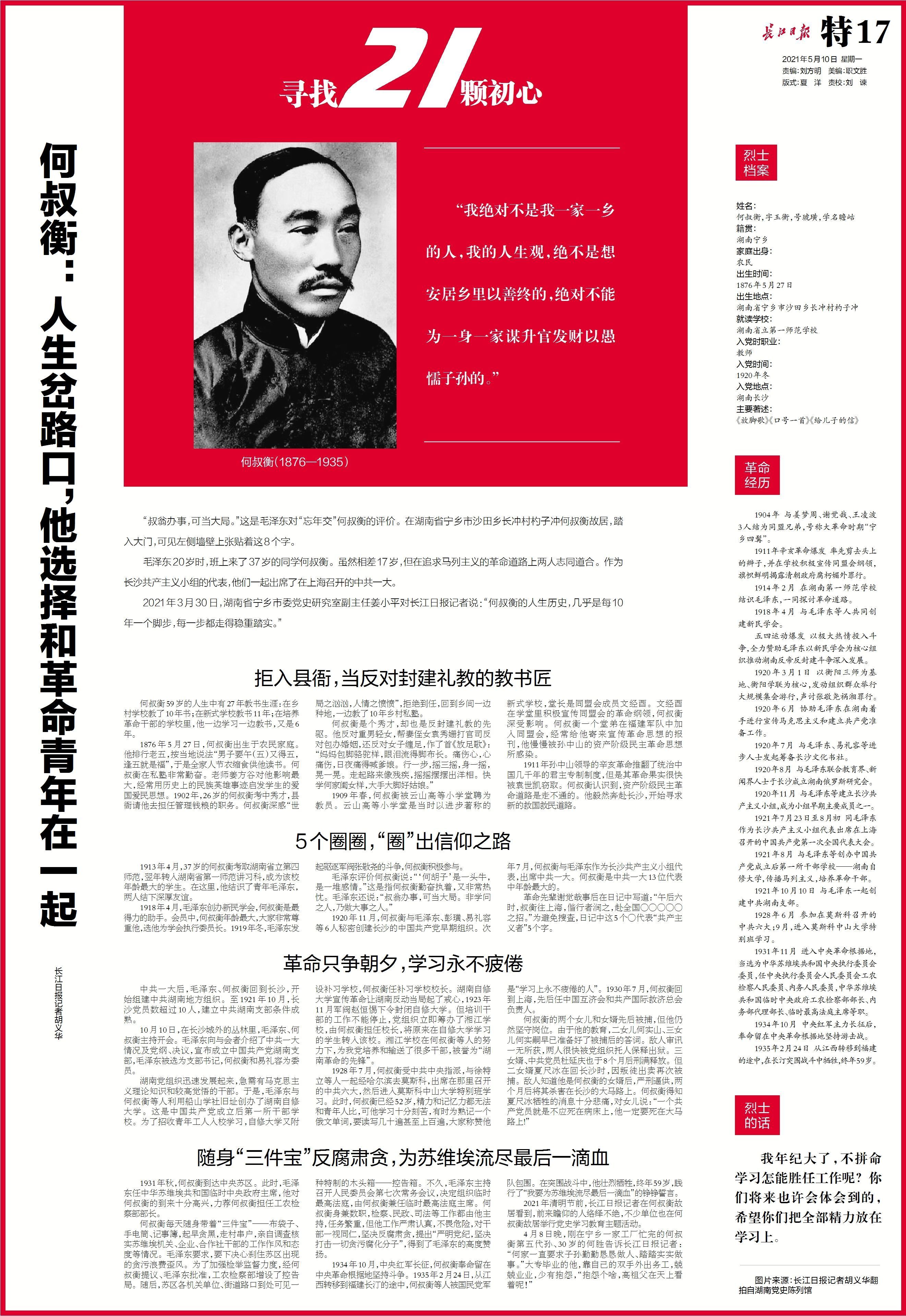 长江日报今日推出20版特刊《寻找21颗初心》,缅怀先烈,赓续共产党人精神血脉,汲取前行力量。