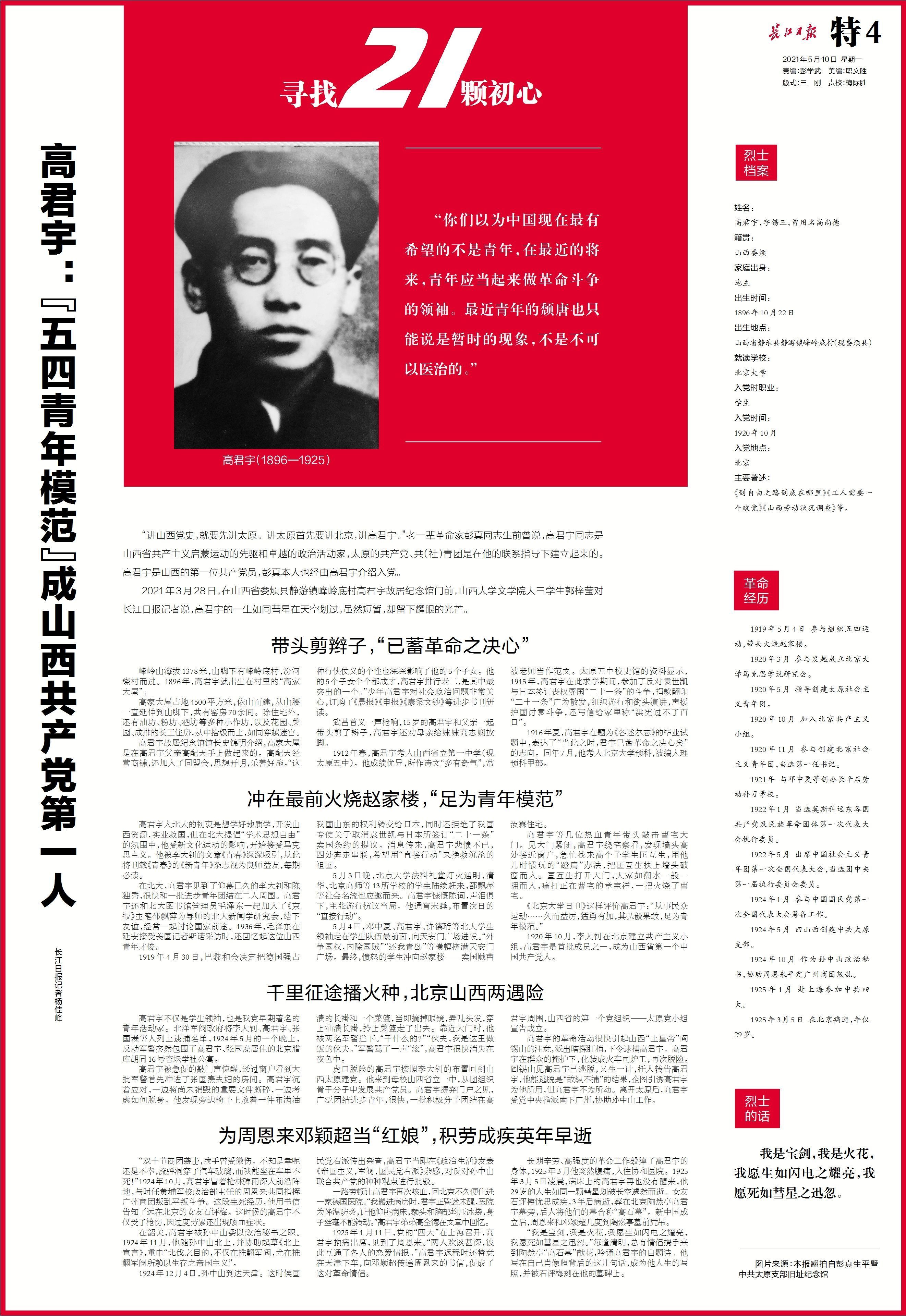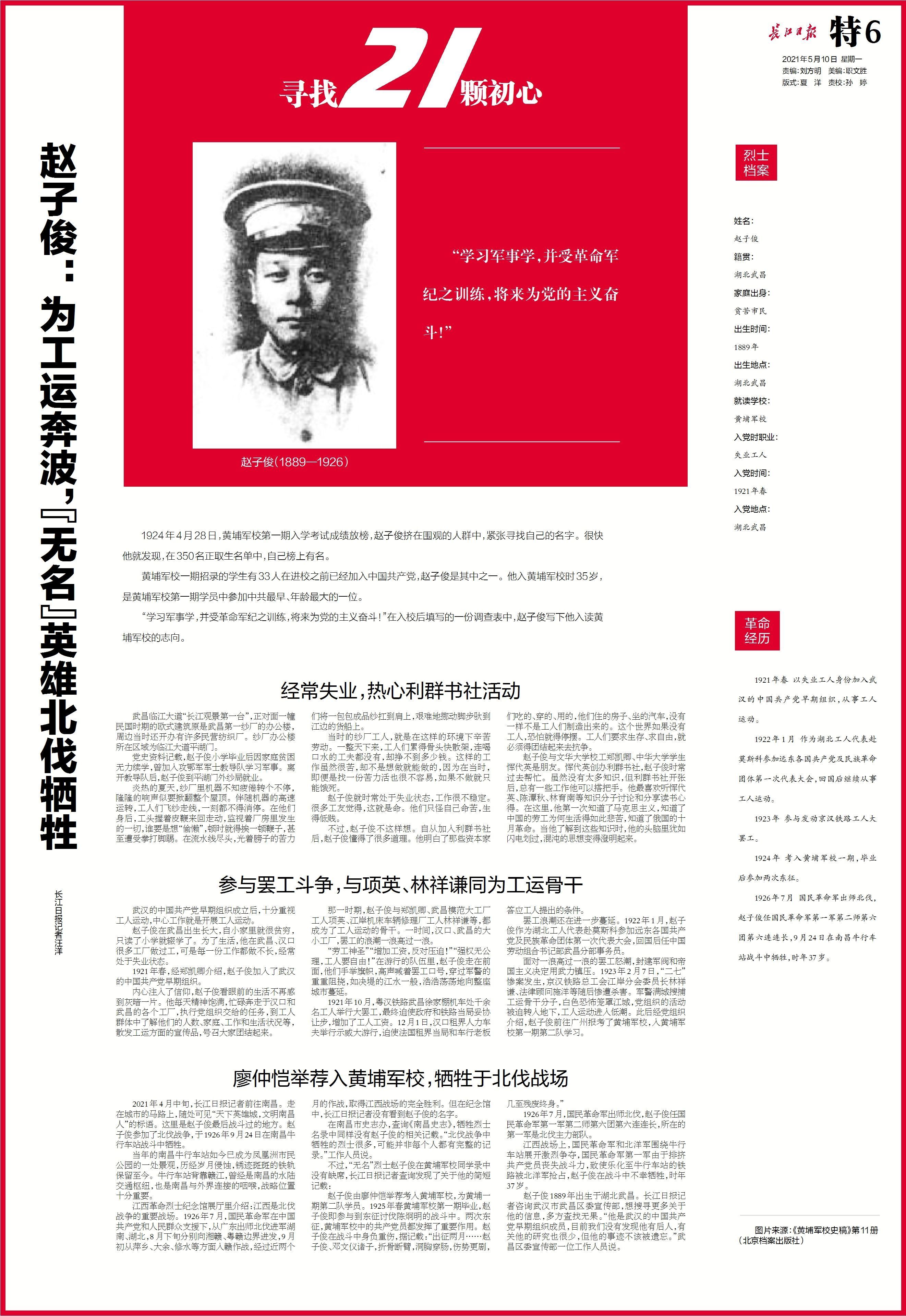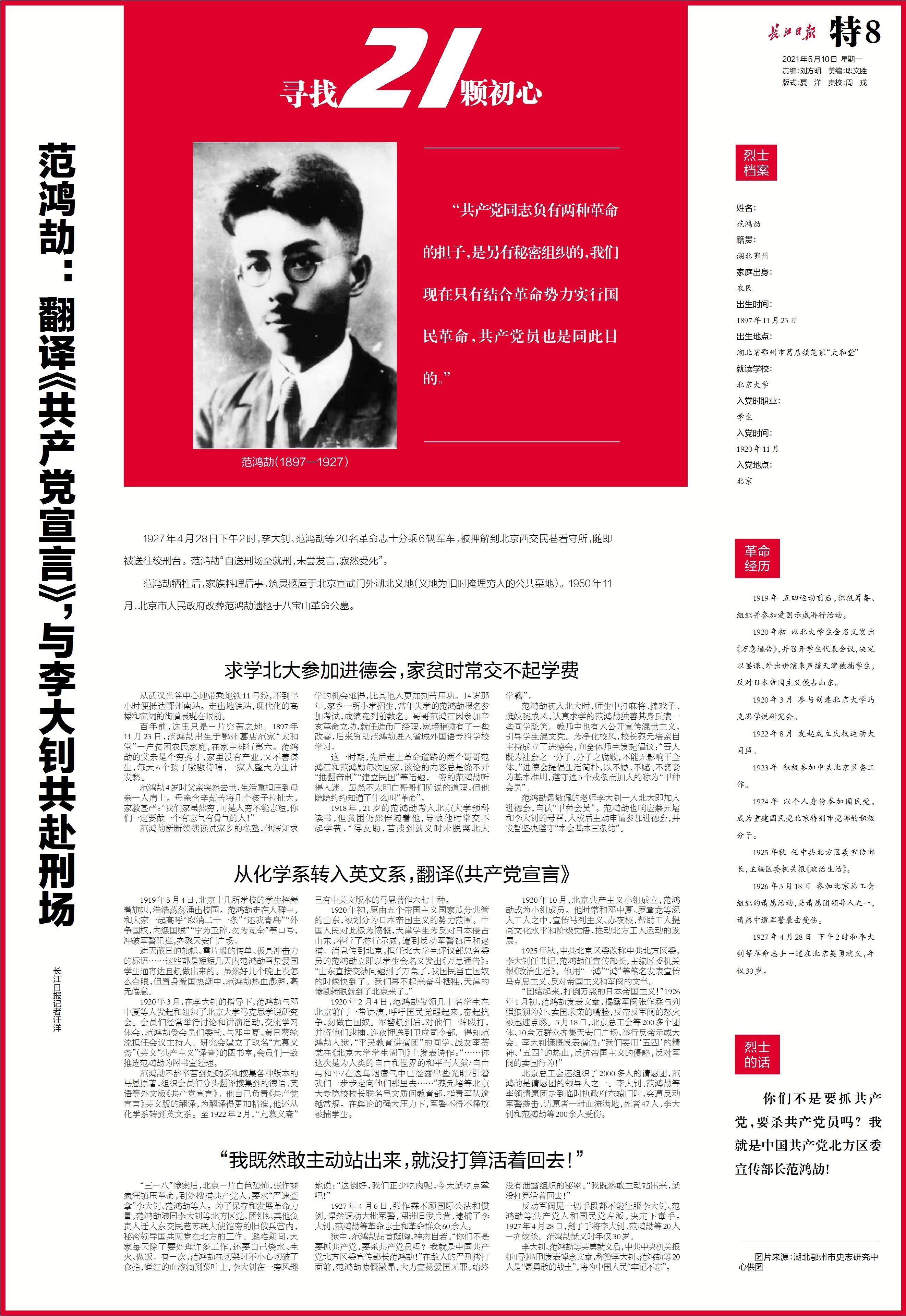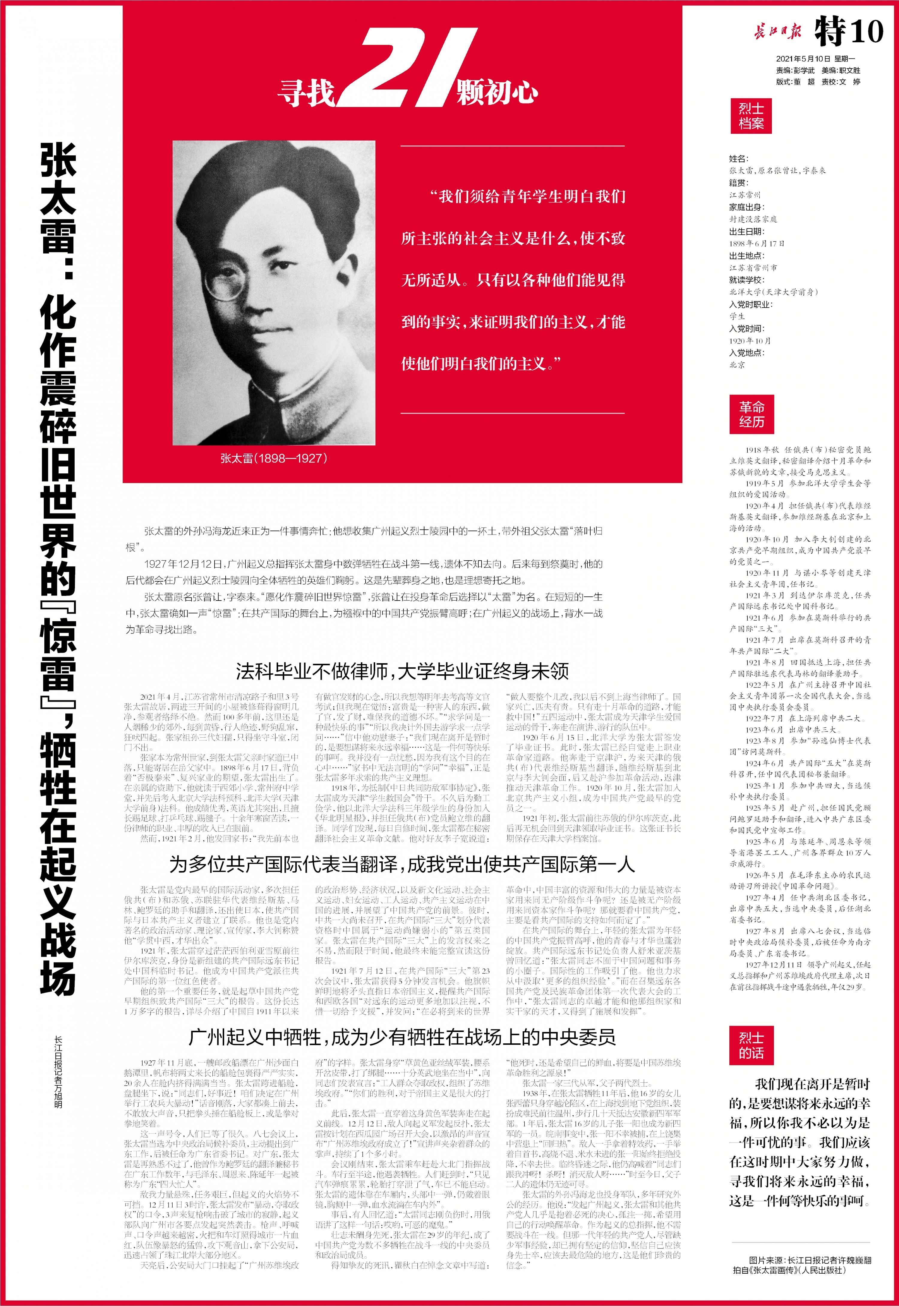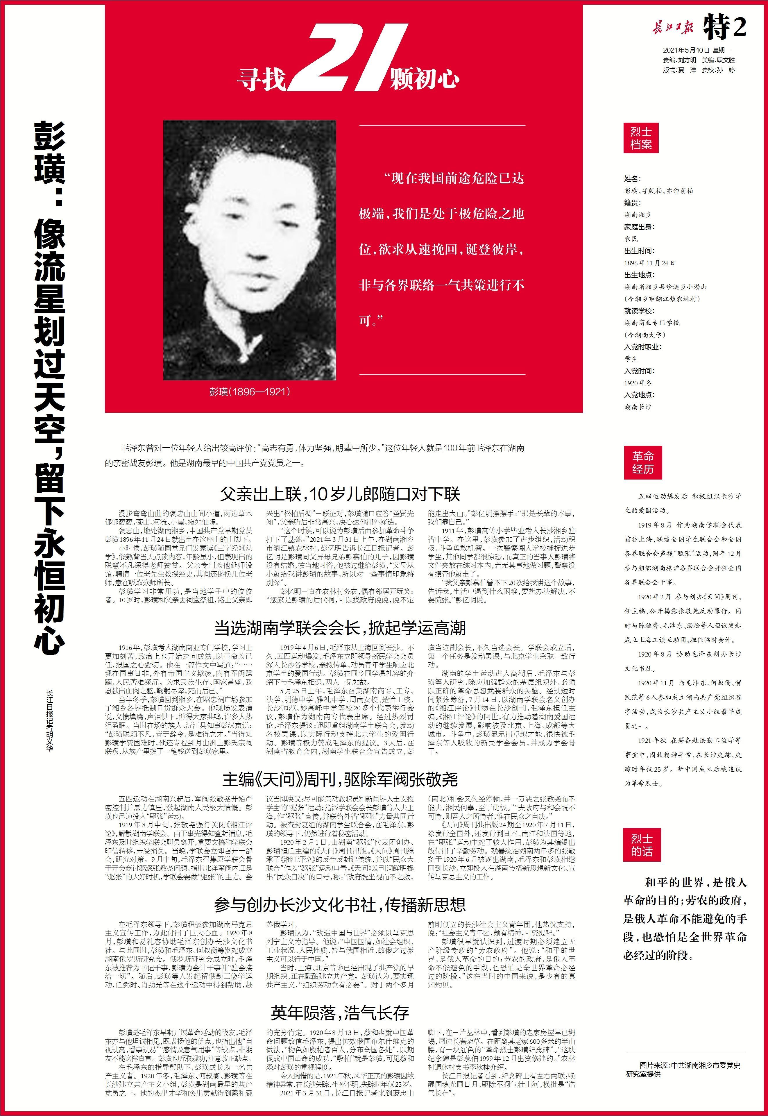 长江日报今日推出20版特刊《寻找21颗初心》,缅怀先烈,赓续共产党人精神血脉,汲取前行力量。