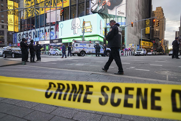 5月8日,警察在美国纽约时报广场的枪击发生地点附近工作。(新华社记者 王迎摄)