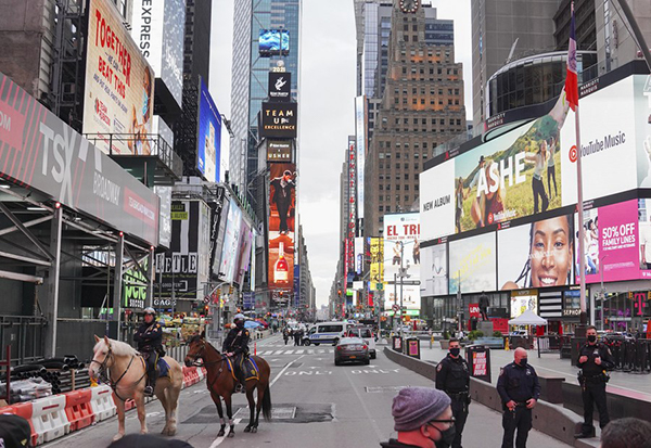 新冠疫情暴发前,时报广场是纽约热门旅游景点之一。去年3月,广场附近剧院全部关闭,定于今年9月14日重新开放。