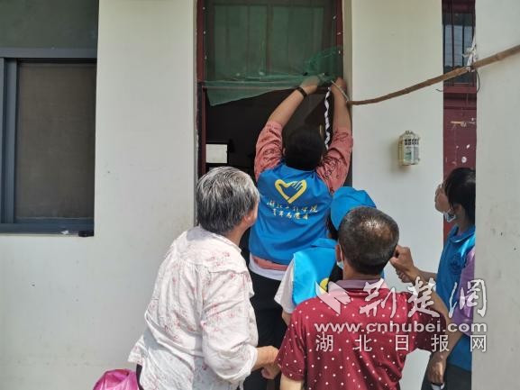 志愿者为老人装防蚊门帘。通讯员 供图