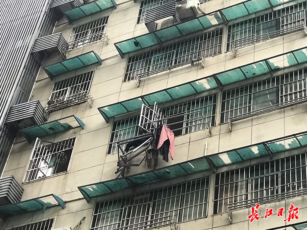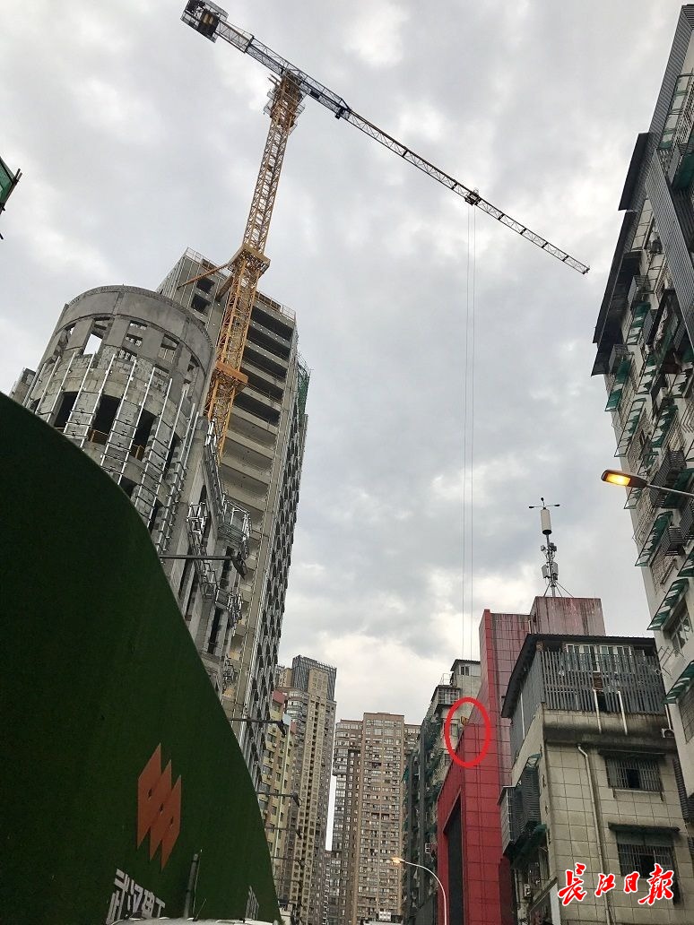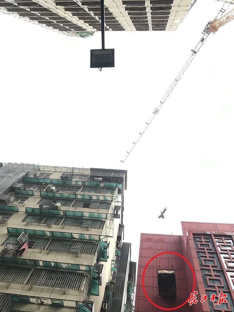 长江日报5月10日讯 5月10日下午,狂风暴雨大作,江岸区黄石路与吉庆街交会处的老通城文化风情街工地,高空塔吊下的运送斗偏移方向,打在旁边一户居民楼的阳台晾衣架上,后悬挂于避风的两栋楼房之间。记者到现场时四周已拉上警戒线,工作人员正在操作塔吊,准备将运送斗放至地面安全位置。(长江日报记者周超 摄影报道)