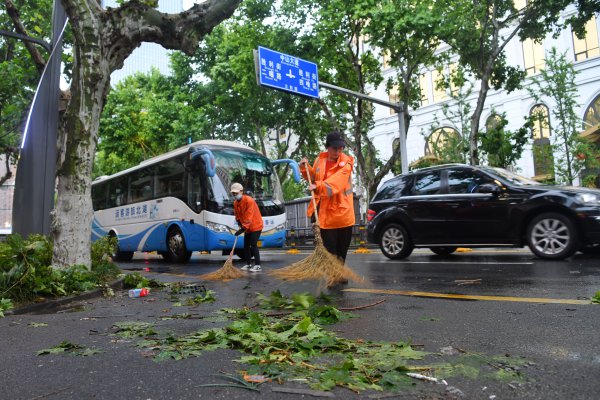 骤雨初歇的汉口三阳路街头,环卫工人正在清扫树枝树叶。长江日报记者苗剑 摄