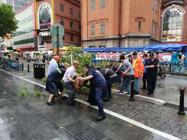 江汉区园林局绿化队安排了8支突击抢险队,在倒树断枝发生的第一时间,便赶赴前进一路自治街、任冬社区、前进四路、民生路、大兴二路、沿江大道、和平里社区等现场开展抢险工作。